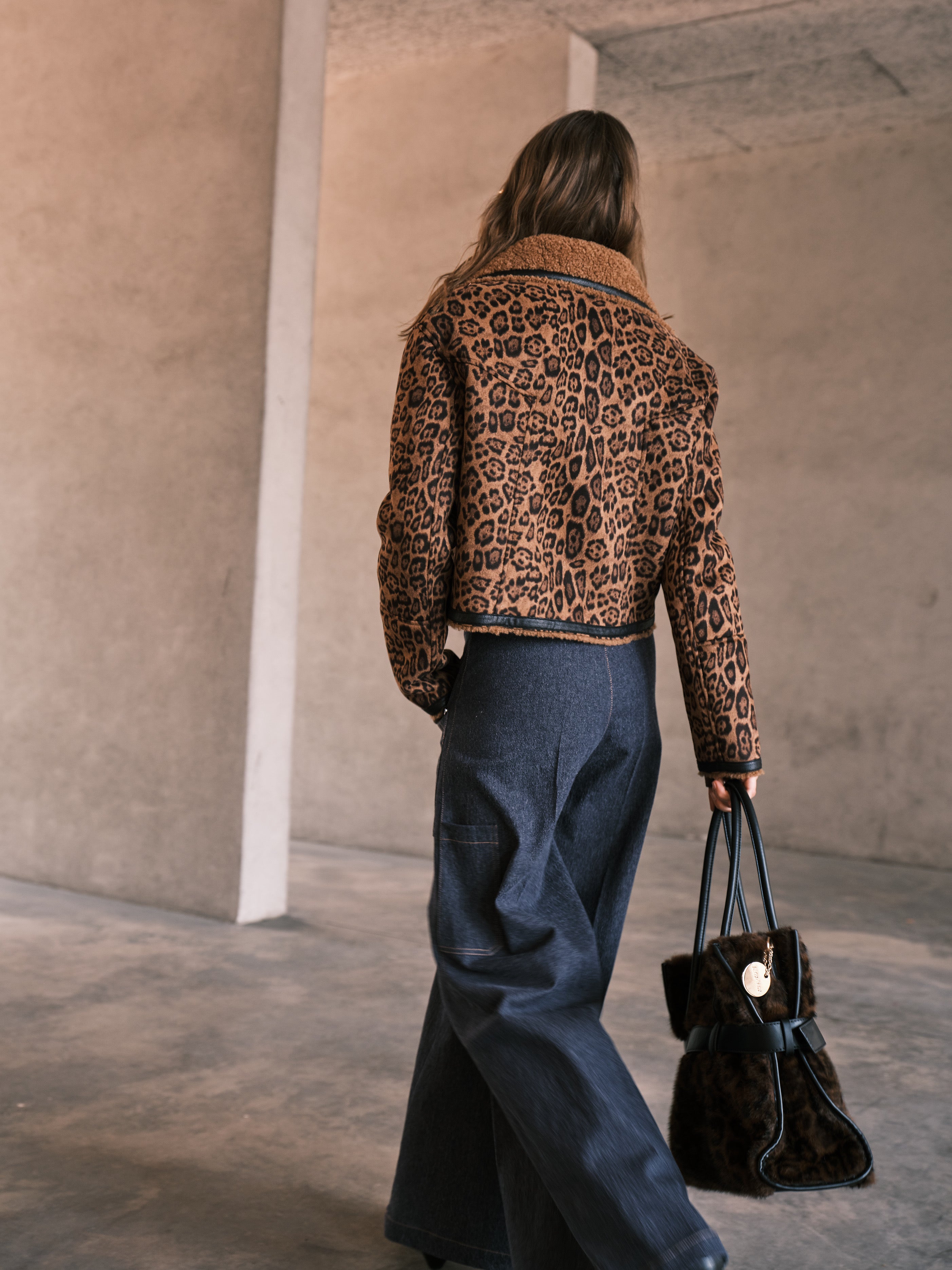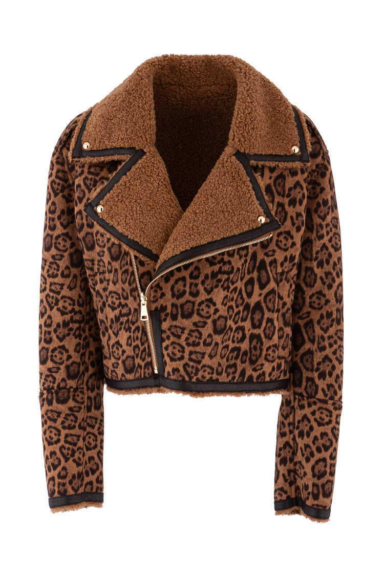 A trendy biker jacket with a bold leopard print design, crafted from warm fabric with soft faux fur details. Features an asymmetric zipper closure for a modern, edgy look and a cozy lined collar. Perfect for creating a unique urban style during colder days.