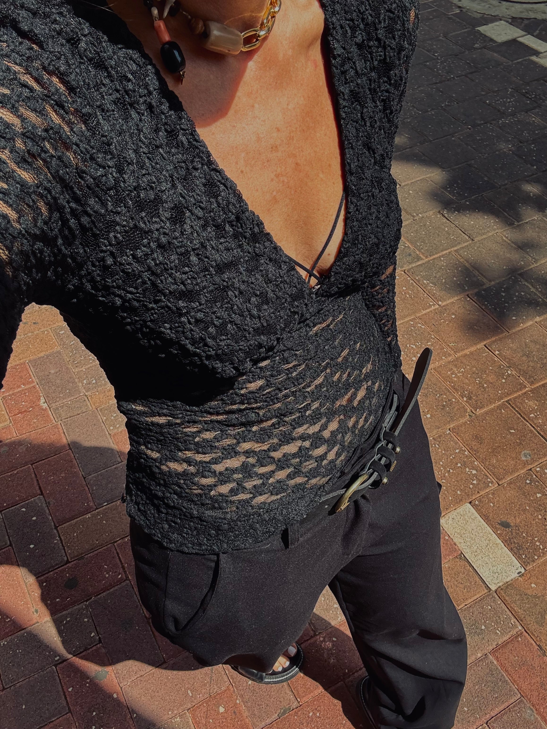 חולצת קרושה שחורה עם מחשוף V ושקיפות עדינה, משולבת עם מכנסיים במותן גבוהה ואביזרים כמו שרשרת דומיננטית ותיק עור