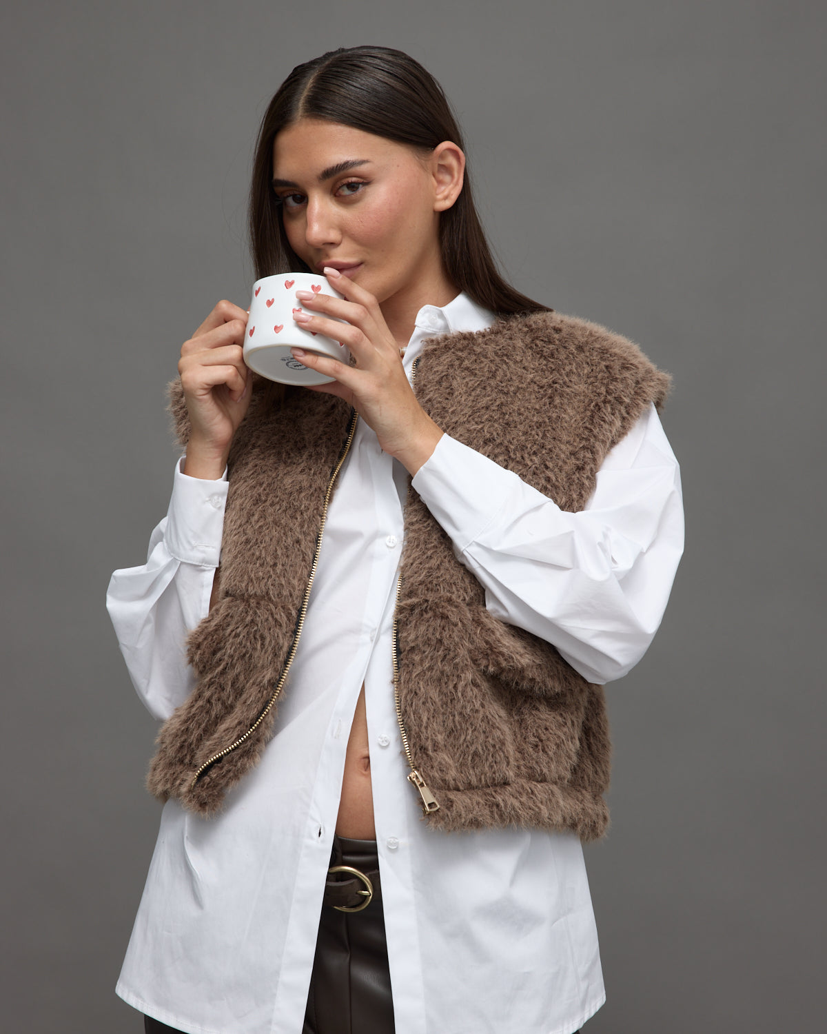 תיאור: ווסט פרווה סינטטי רך בצבע חום חמים, עם כיסים קדמיים ורוכסן מלא – אידיאלי לשילוב בלוק יומיומי או אלגנטי