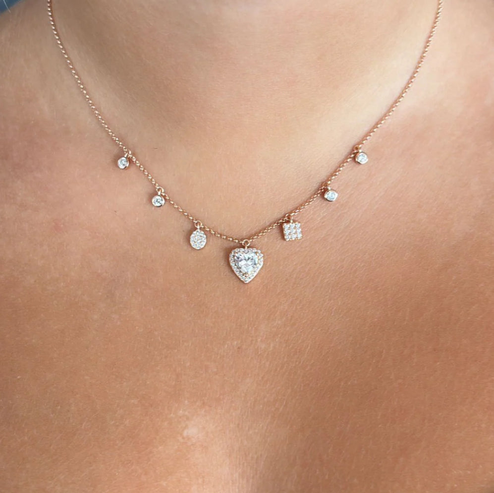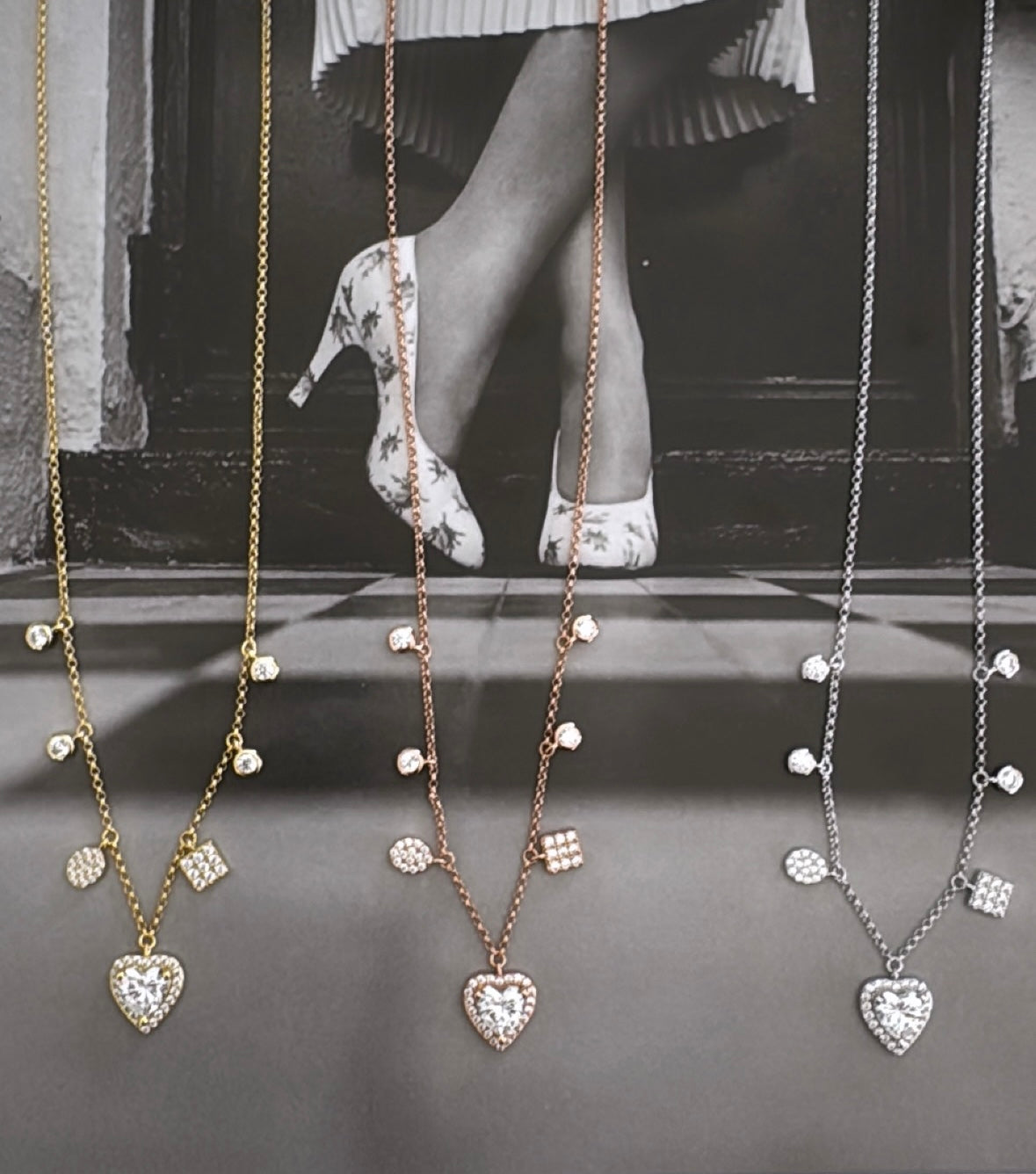 A genuine silver necklace, available in gold and rose gold plating, featuring a sparkling heart pendant with chic dangling charms.