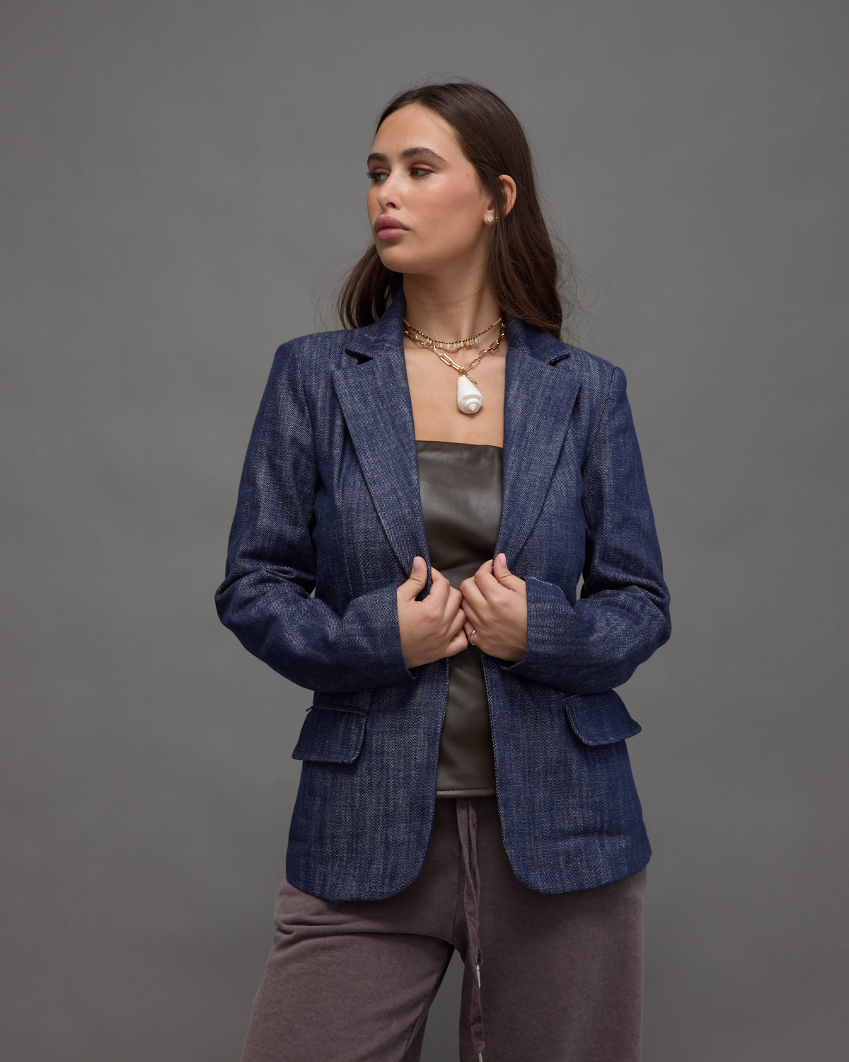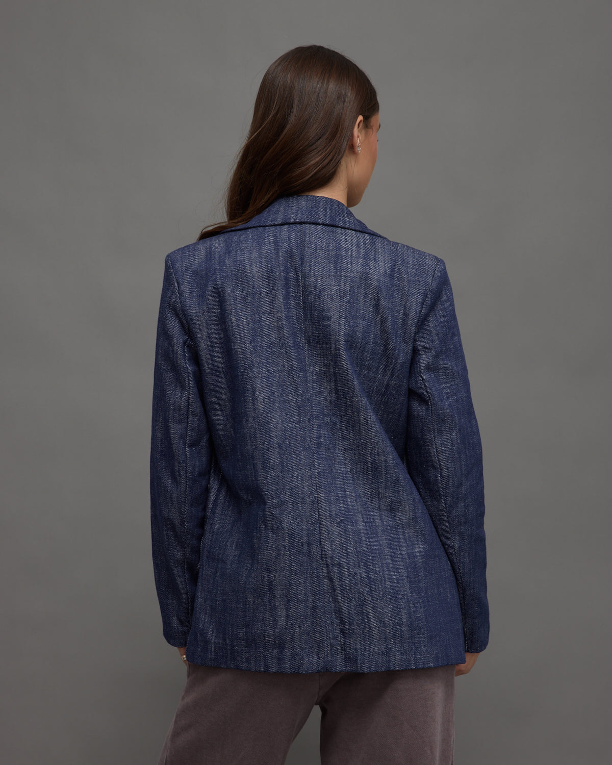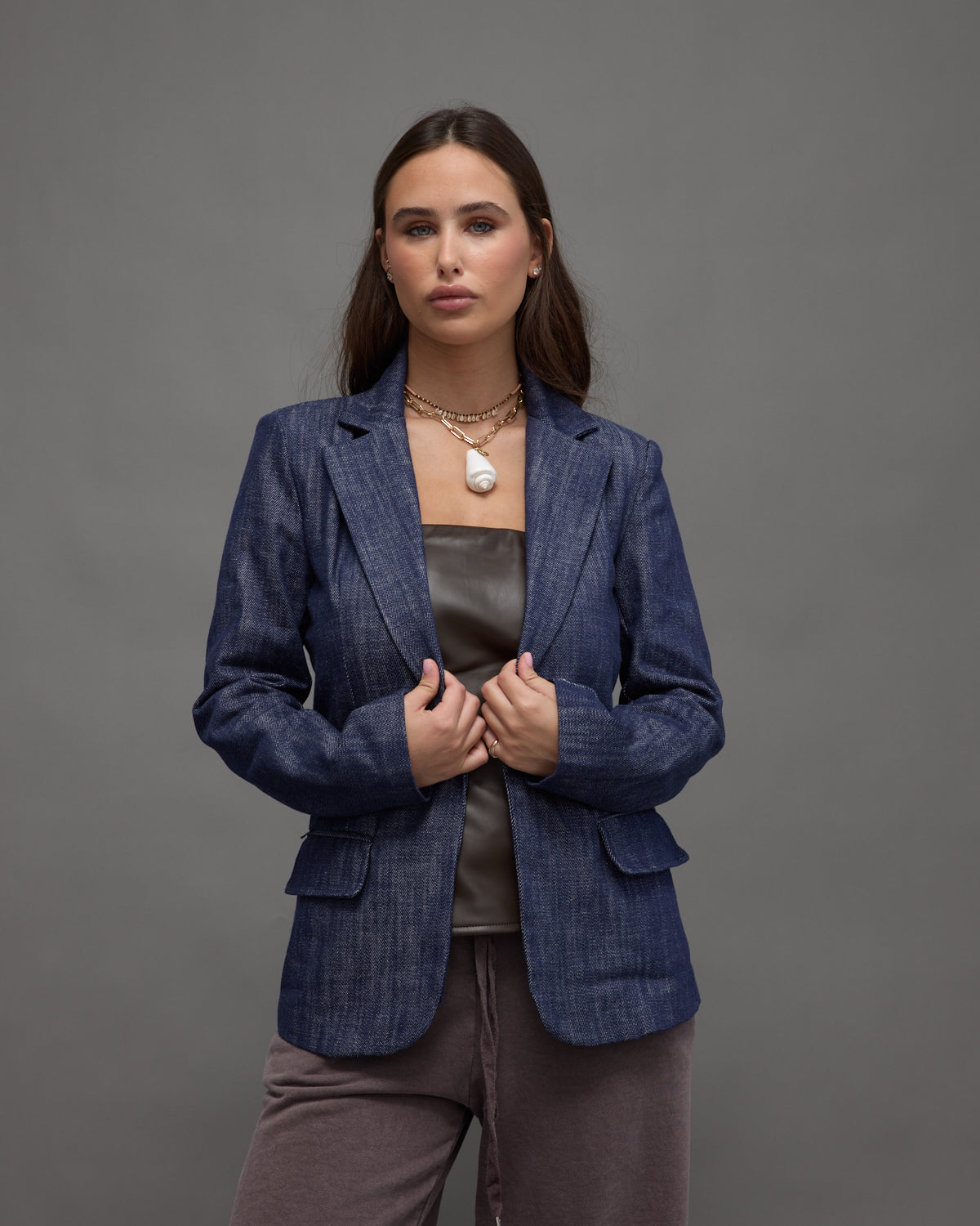 • A structured denim blazer with a tailored fit and front flap pockets, bringing a modern twist to a classic style.
