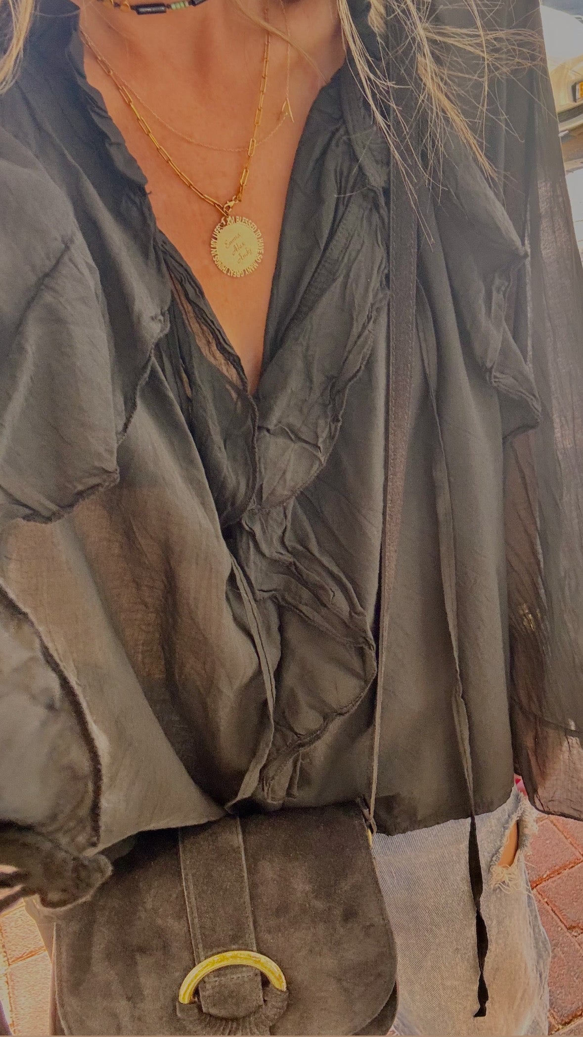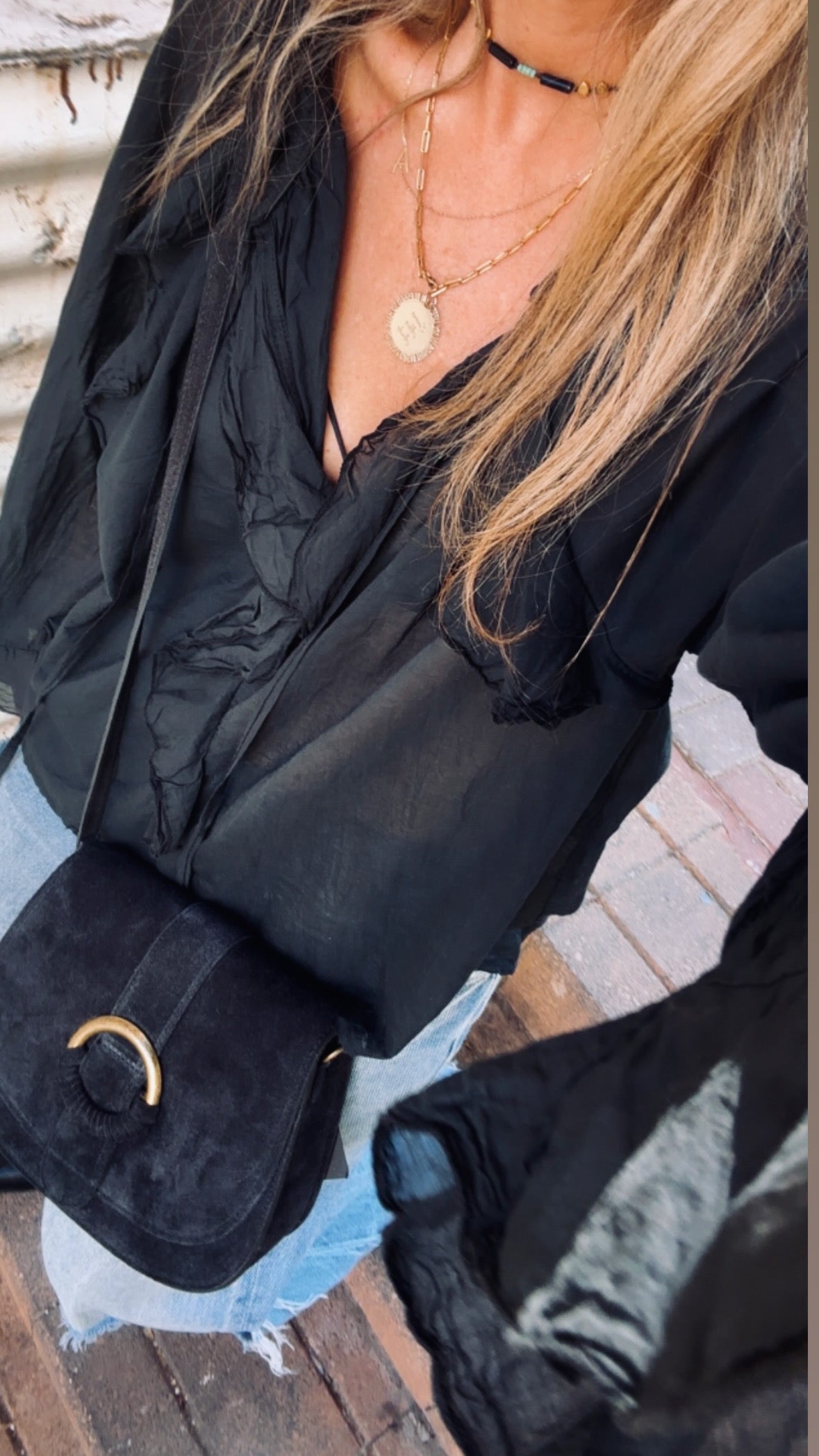 חולצת בוהו בגוון כאמל חמים עם וולנים מדורגים ותחרת חורים עדינה. גזרה רכה ונשפכת למראה רומנטי וחופשי