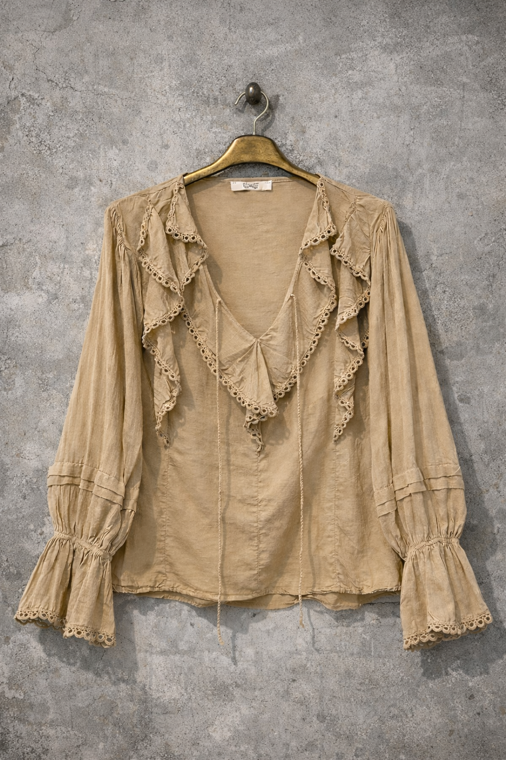 Romantic boho blouse in a soft camel shade with cascading ruffles, delicate eyelet lace trim and feminine front ties. Designed with flowing sleeves for an effortless, free-spirited look.