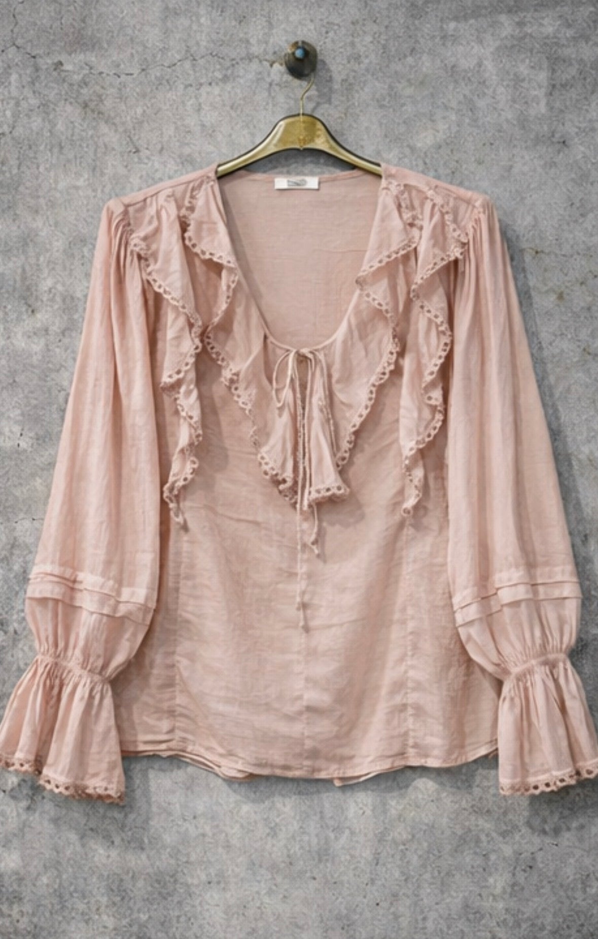 Romantic boho blouse in a soft camel shade with cascading ruffles, delicate eyelet lace trim and feminine front ties. Designed with flowing sleeves for an effortless, free-spirited look.