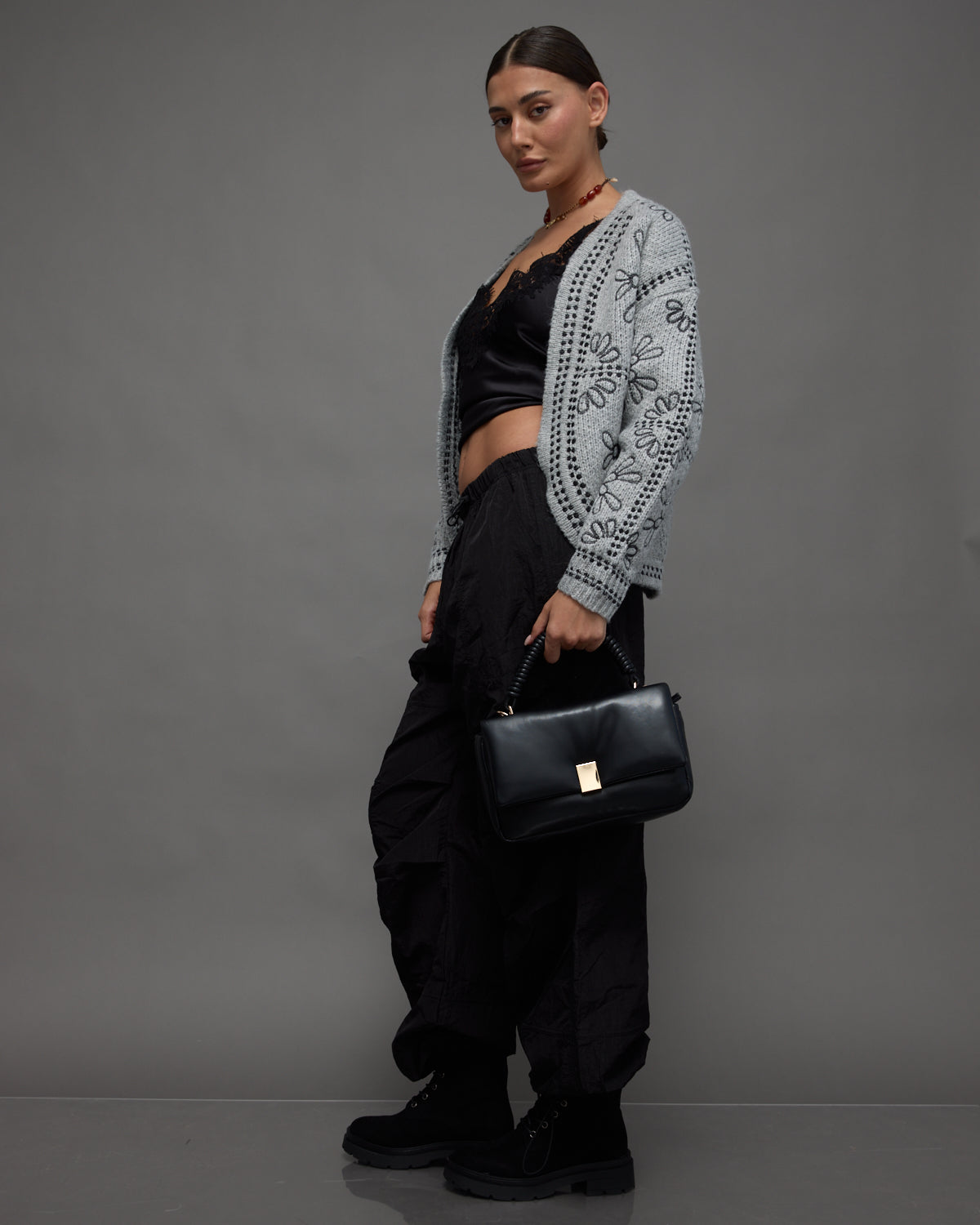 - קרדיגן סרוג בצבע אפור עם רקמת פרחים שחורה ועיצוב פתוח, אידיאלי לשכבה נוספת בלוקים קז’ואליים או שיקיים