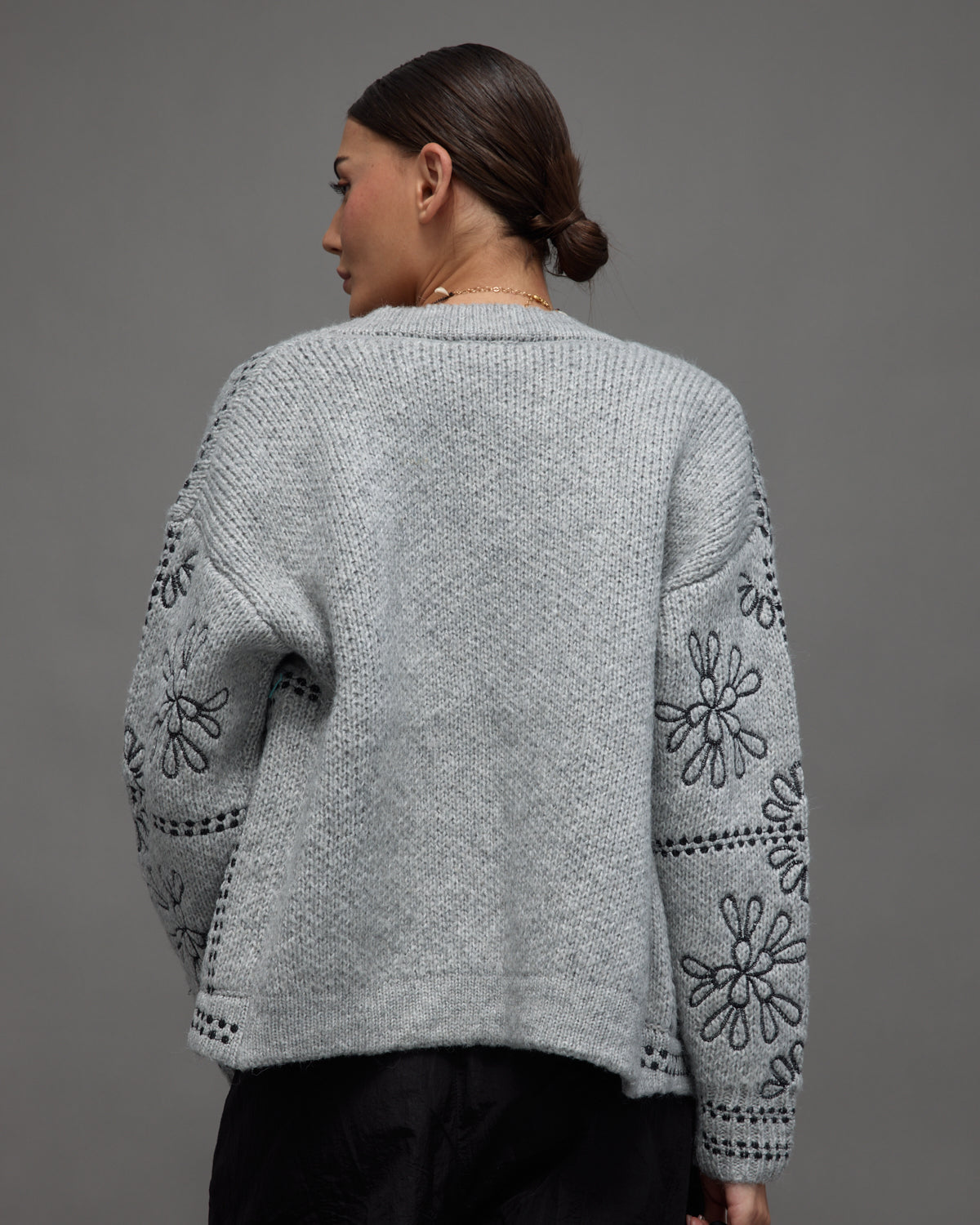 - A grey knit cardigan with black floral embroidery and open-front design, perfect for layering with casual or chic outfits.