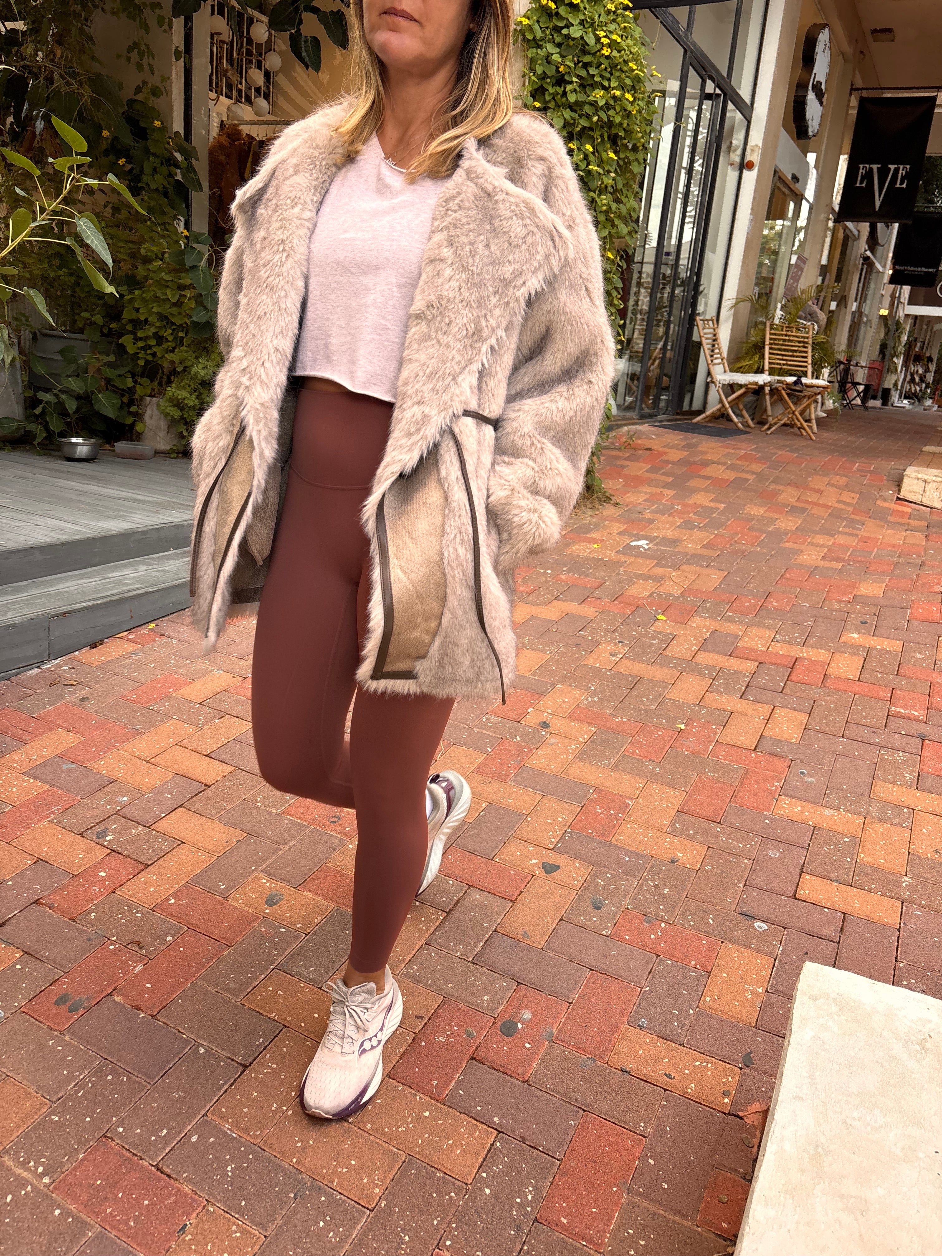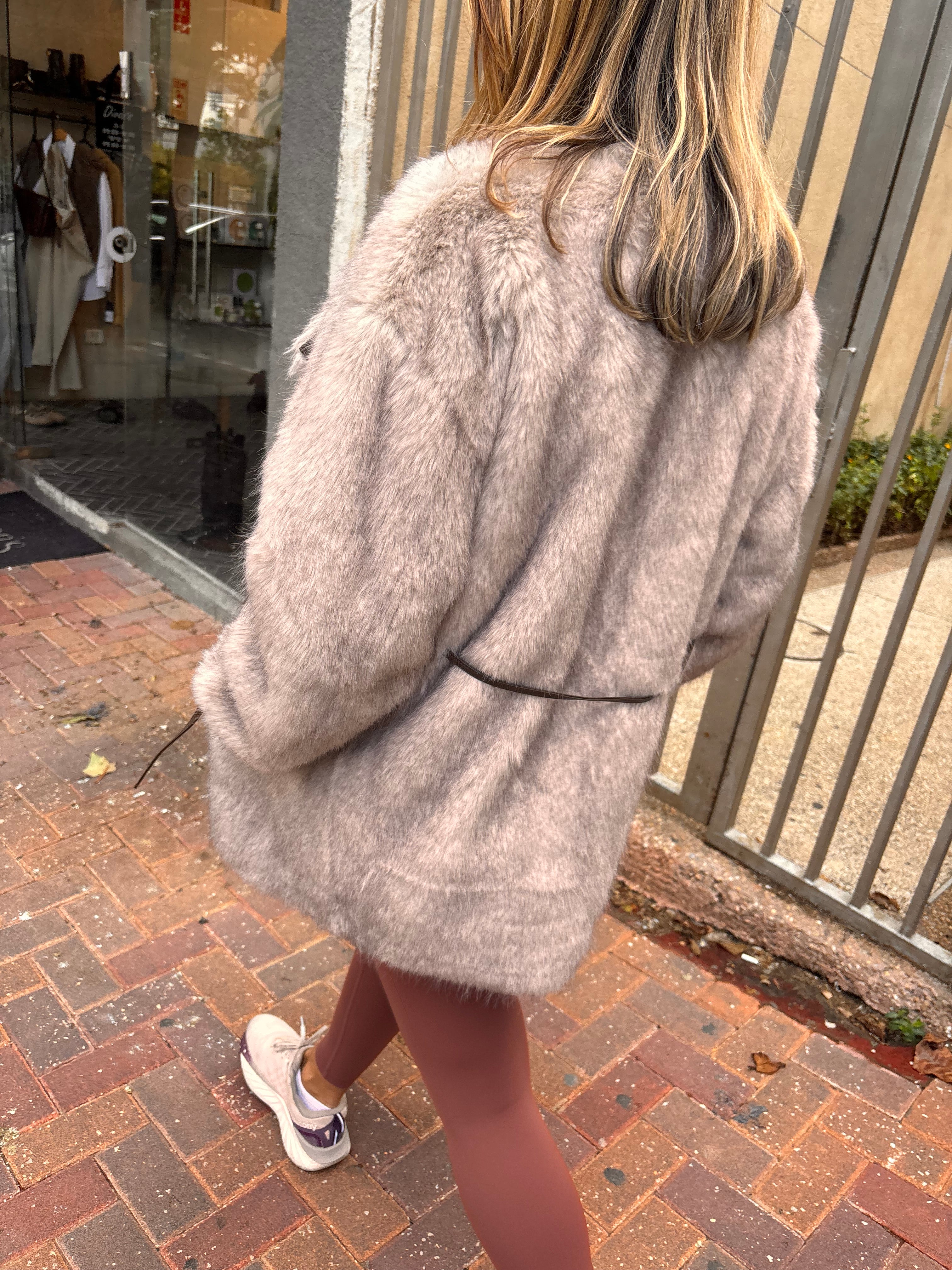 מעיל דמוי פרווה רך ונעים, בגזרה אוברסייז עם קשירה במותן. מושלם למראה חורפי אופנתי ונינוח