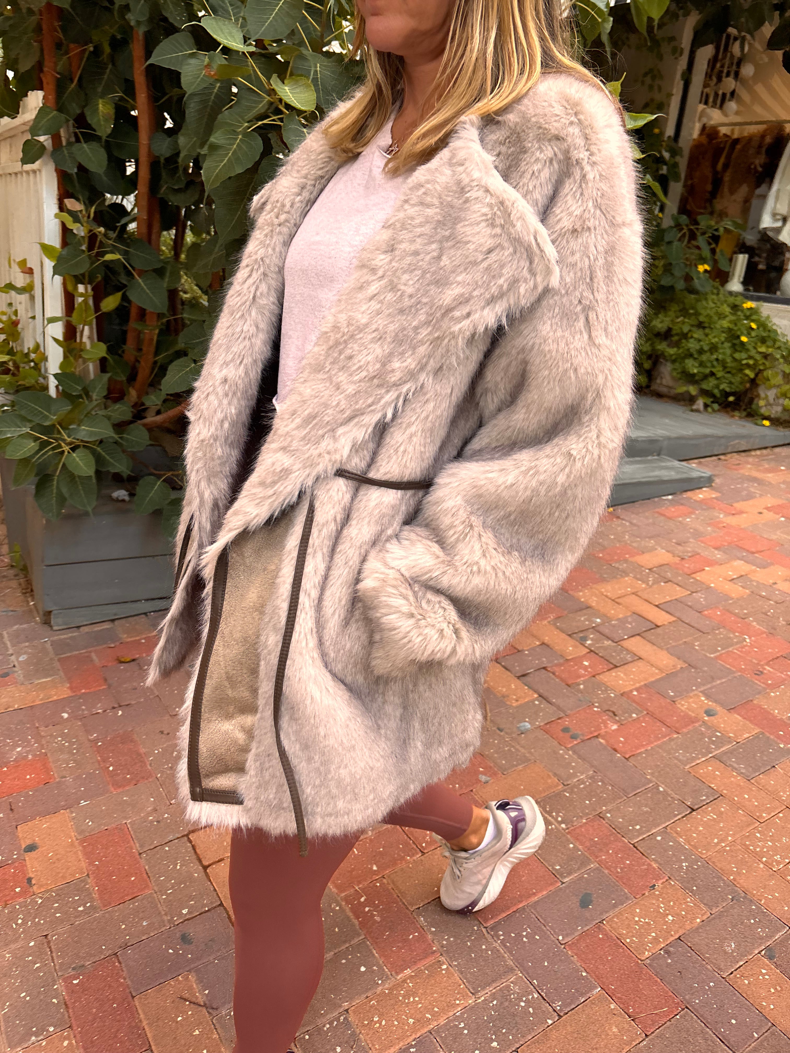 Soft faux-fur coat in an oversized silhouette with a waist tie, perfect for a stylish and cozy winter look.