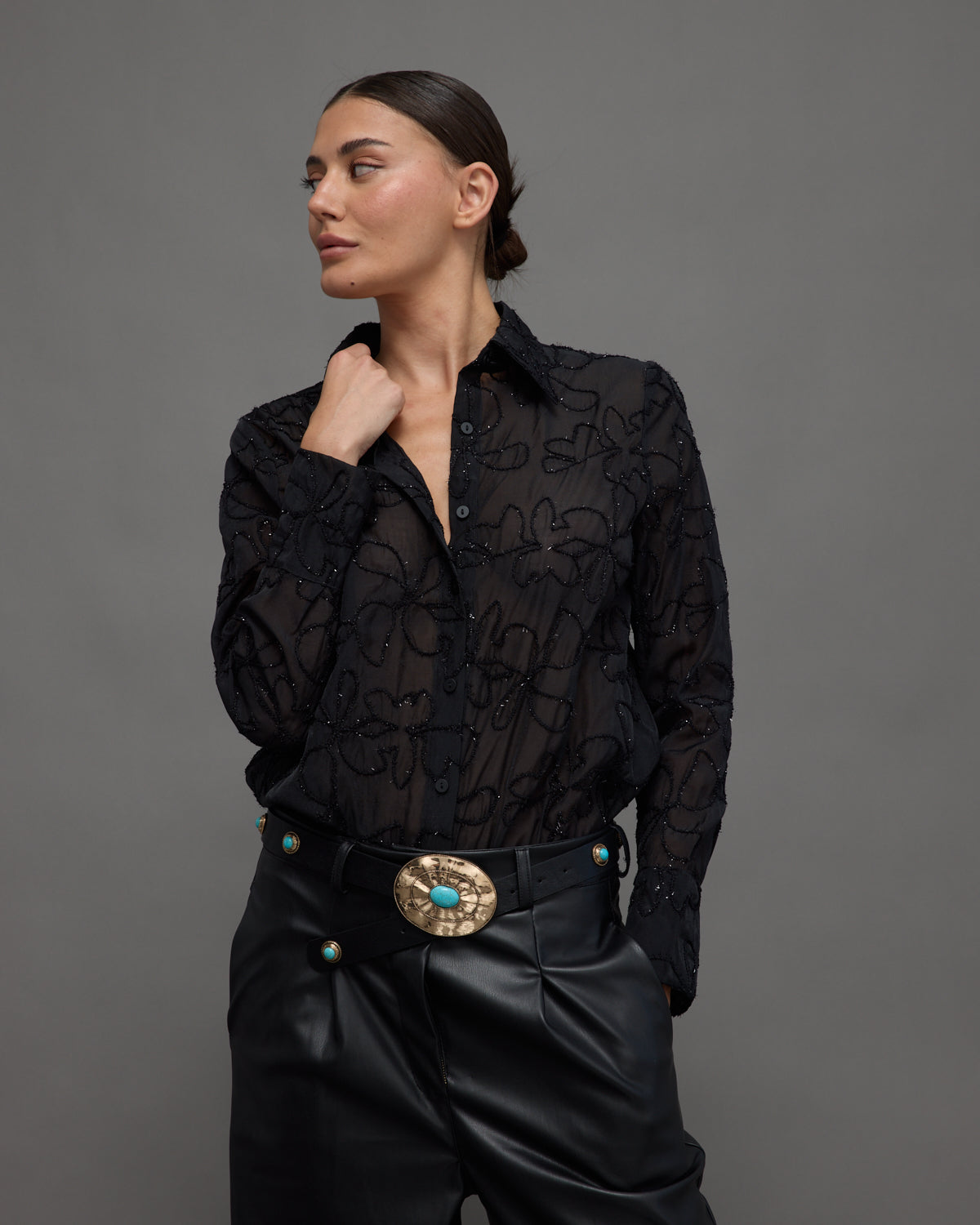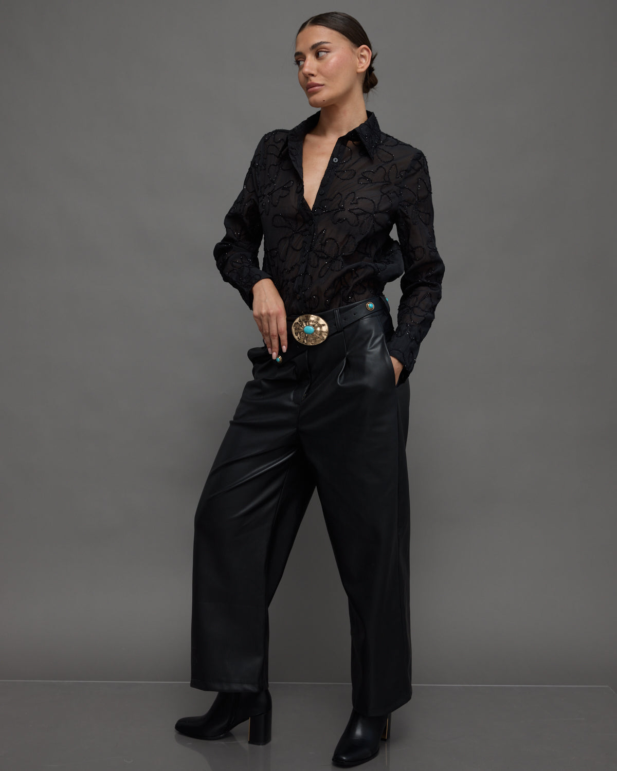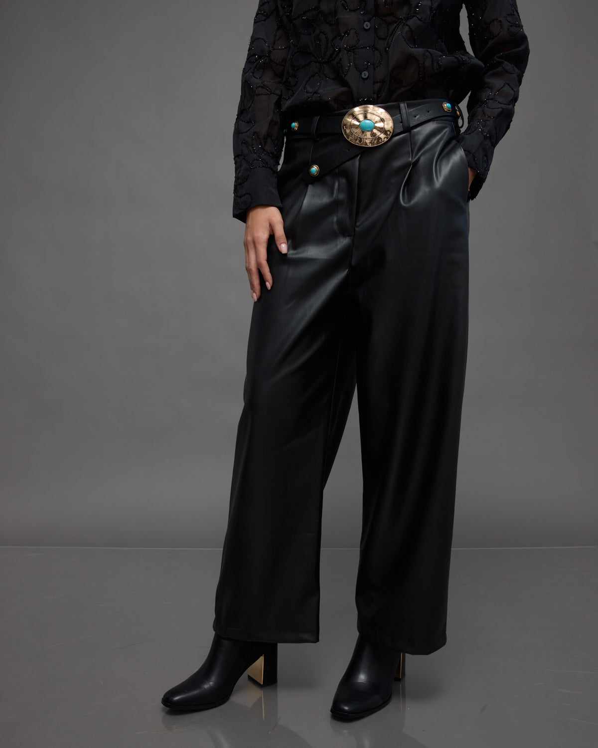 - Black faux leather pants with a relaxed straight cut, combining edgy style with modern elegance.