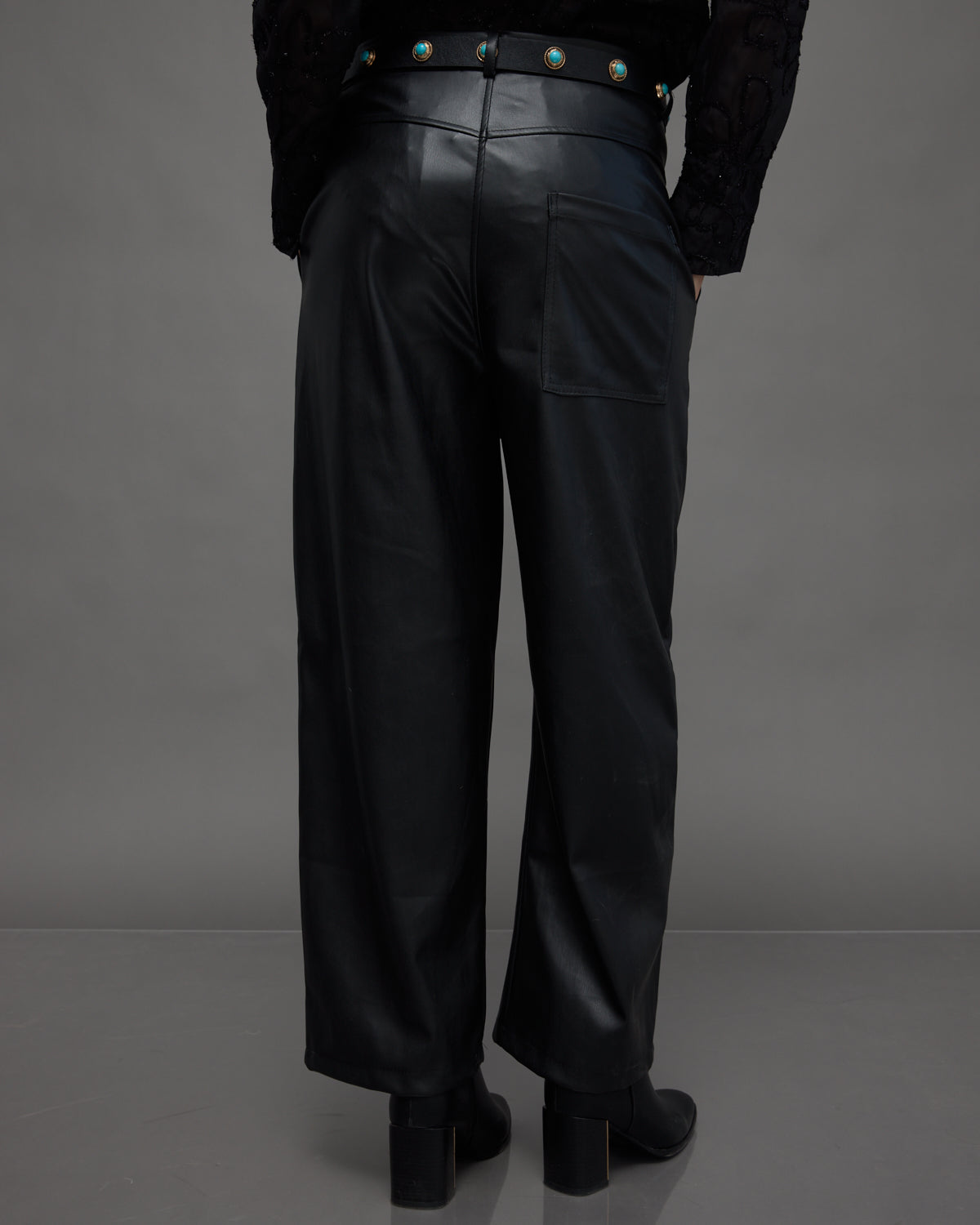 - מכנסי דמוי עור שחורים בגזרה ישרה ונינוחה, שילוב של סטייל נועז עם אלגנטיות מודרנית