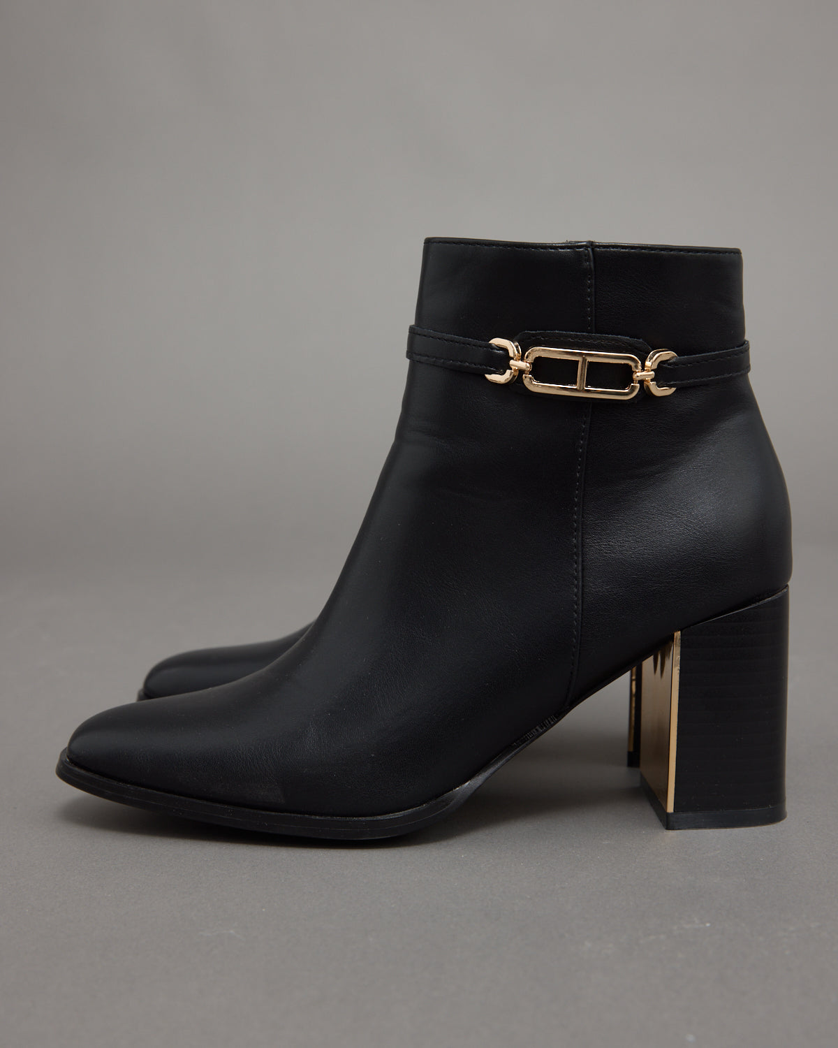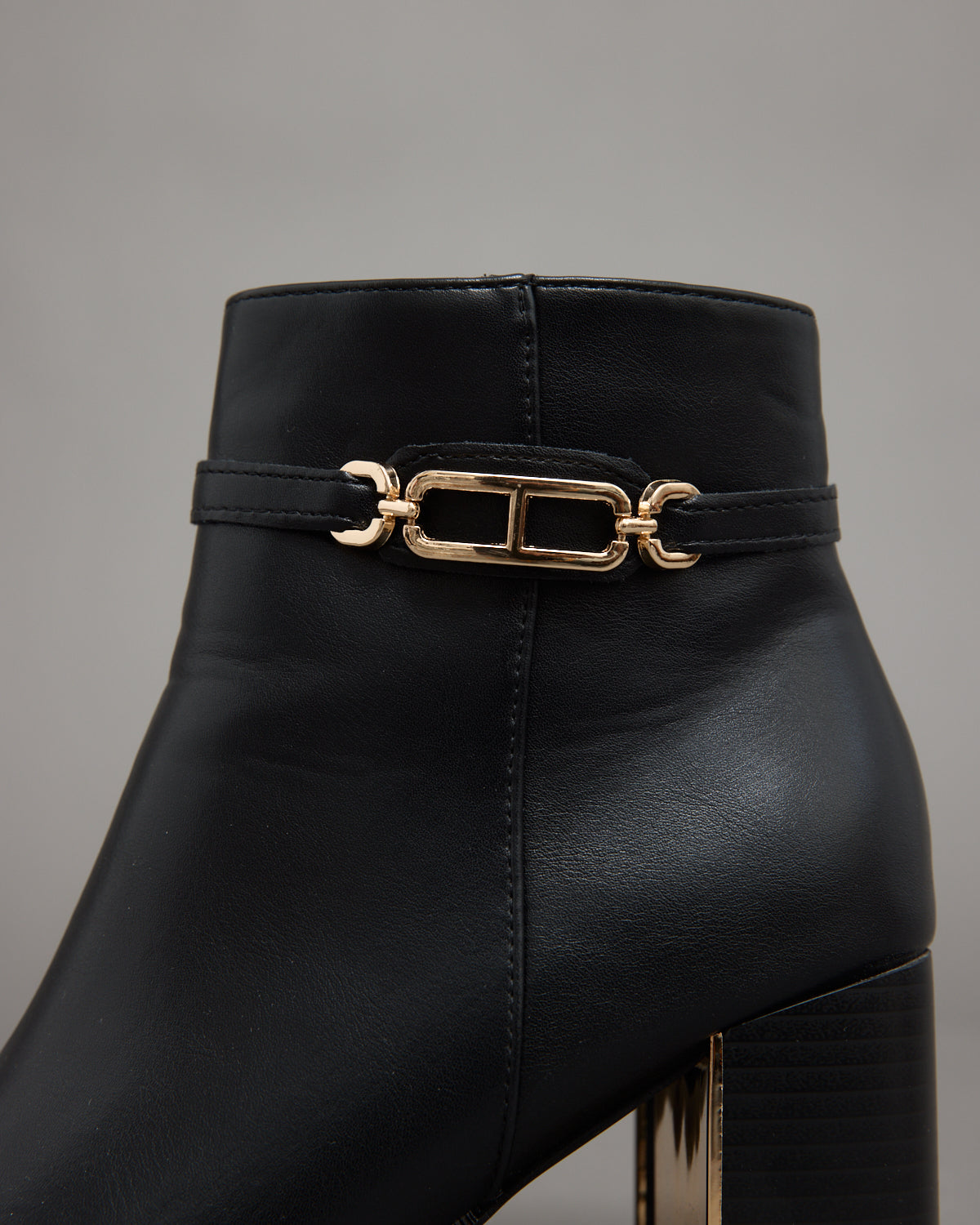 Stylish black ankle boots featuring a gold 6 cm heel with gold detailing, a sleek side zipper, and a bold gold chain accent for a modern, elegant look.