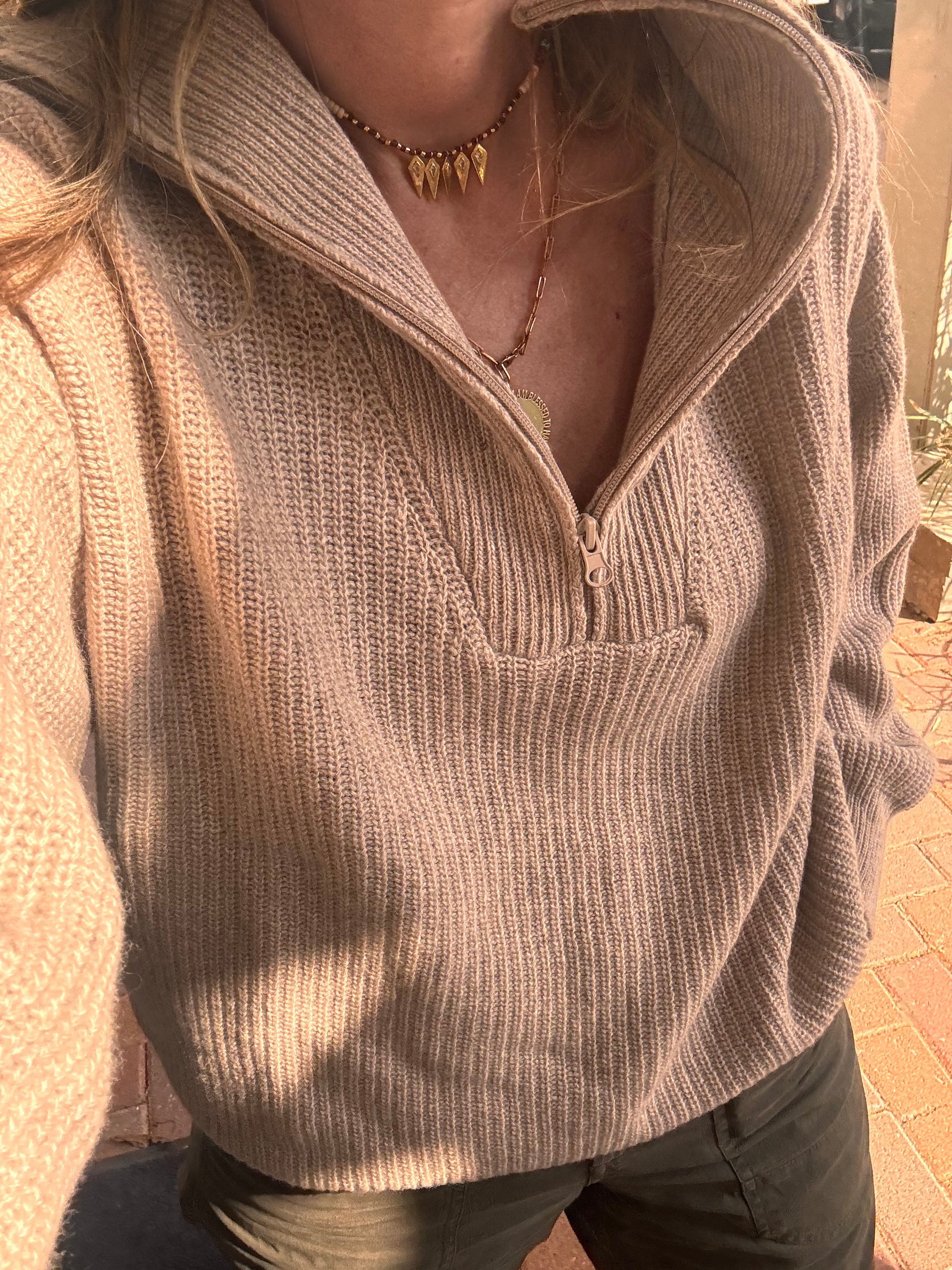 סוודר סריג חום עם צווארון חצי רוכסן, שמשלב נוחות נעימה עם מראה קליל ושיקי. מושלם לשכבות בימים קרירים.