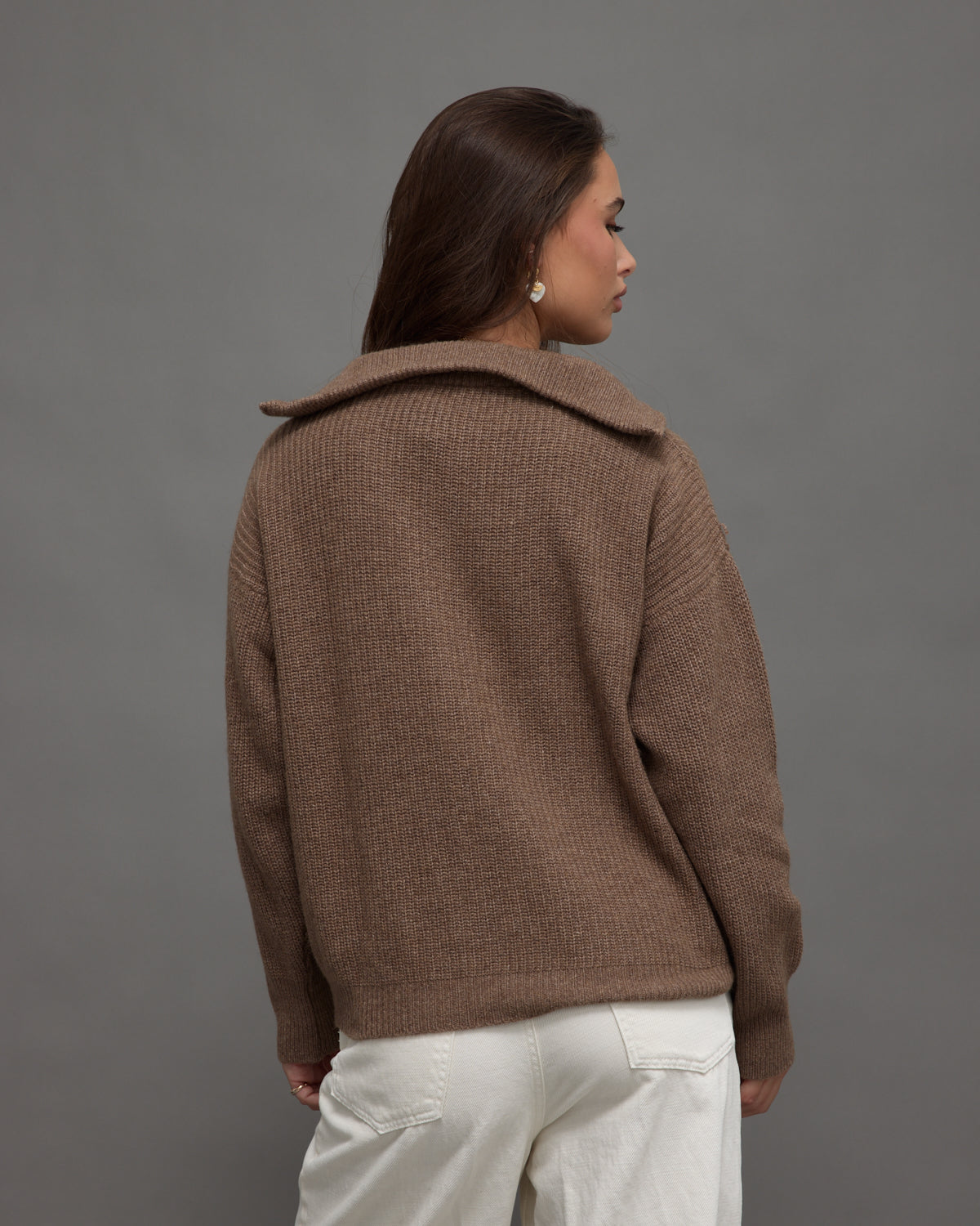 A cozy brown knit sweater with a half-zip collar, blending relaxed comfort with effortless style. Perfect for layering on cooler days.