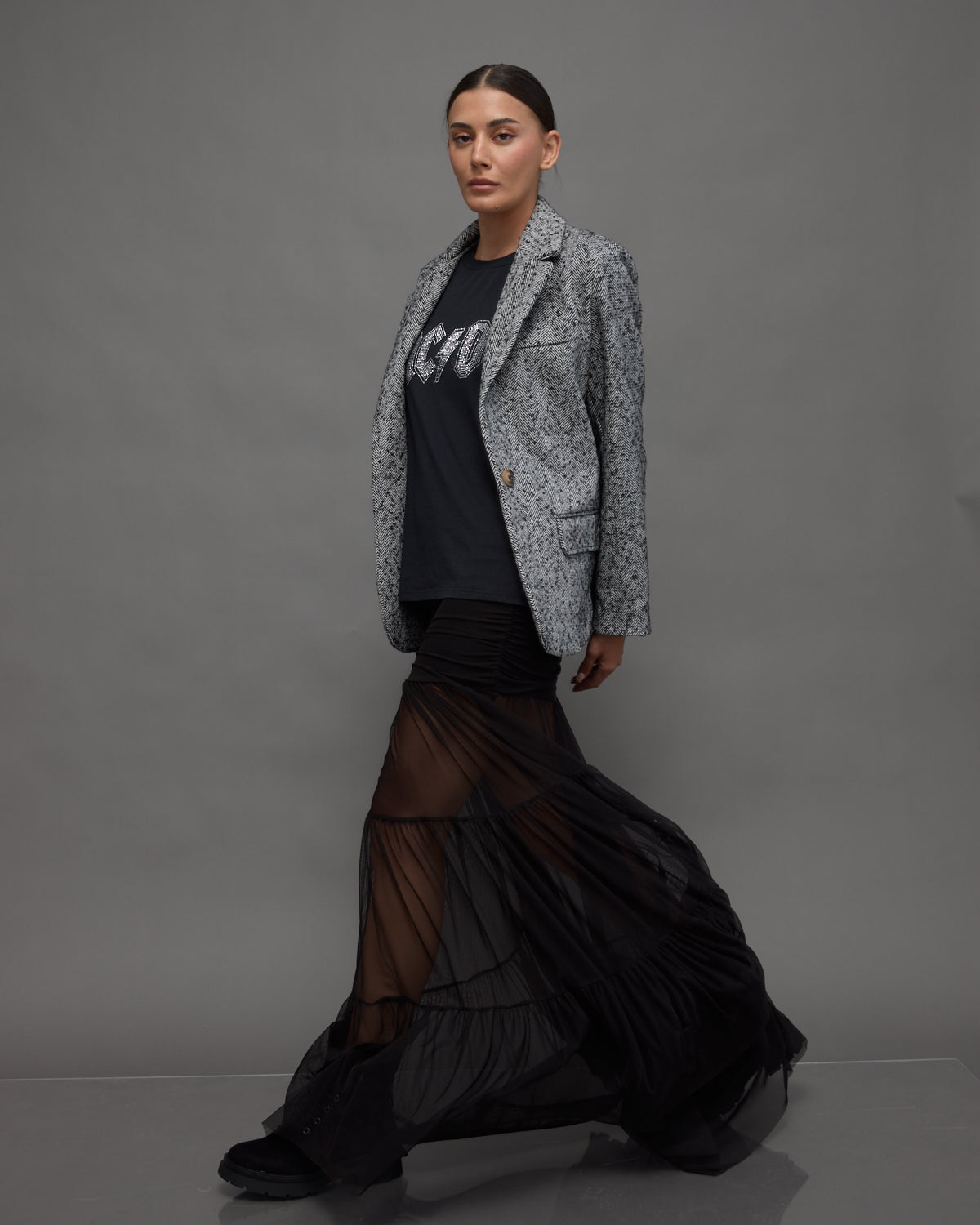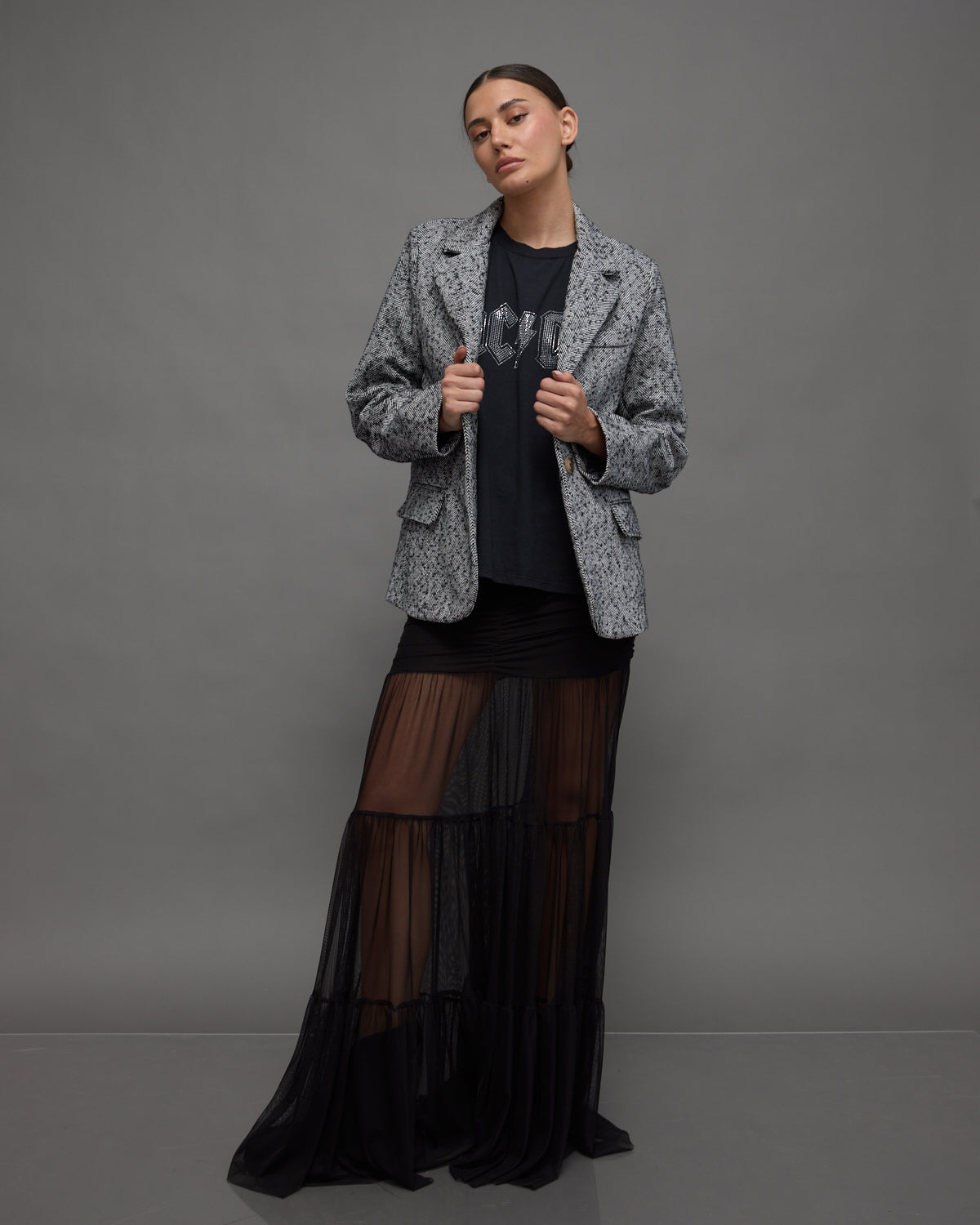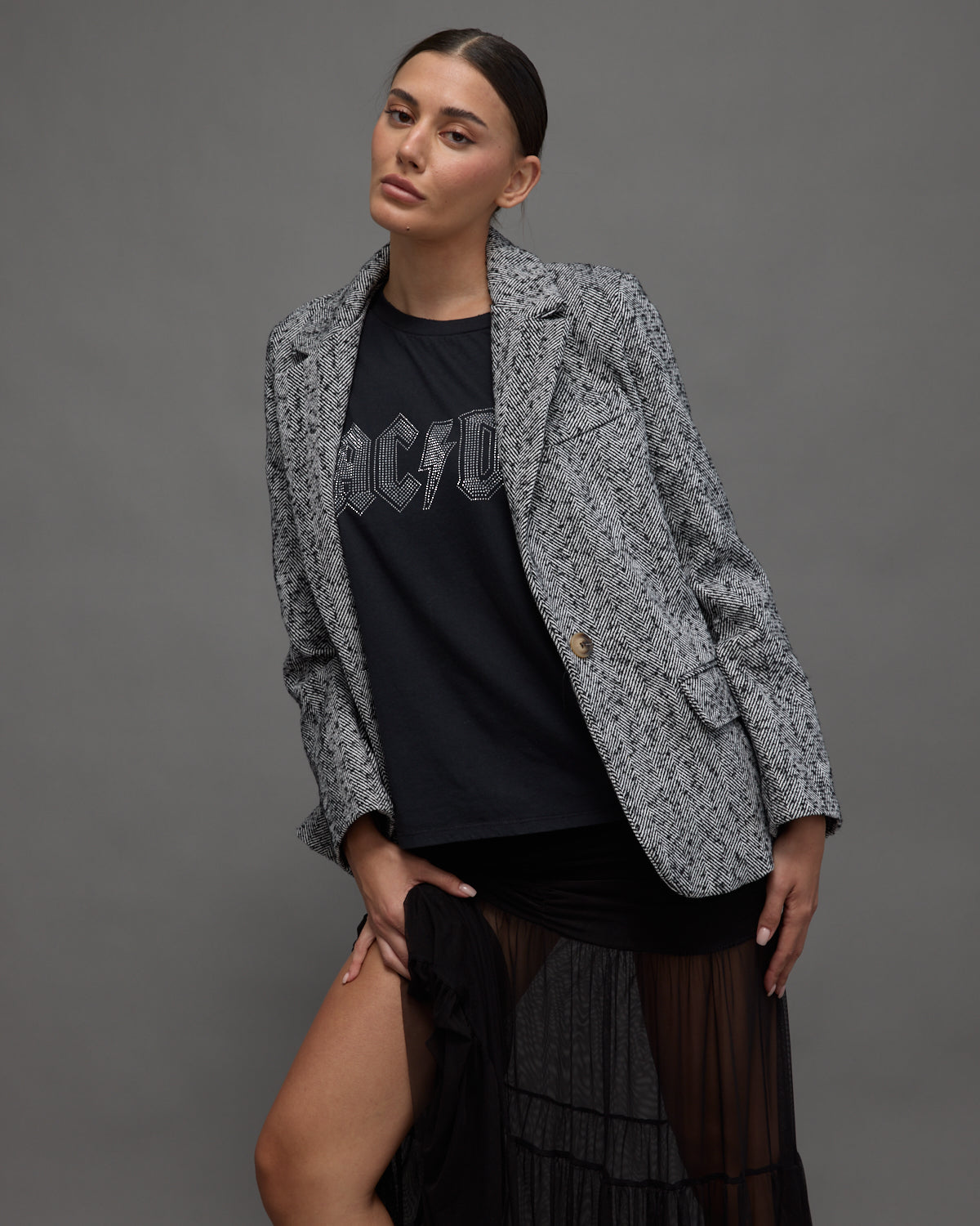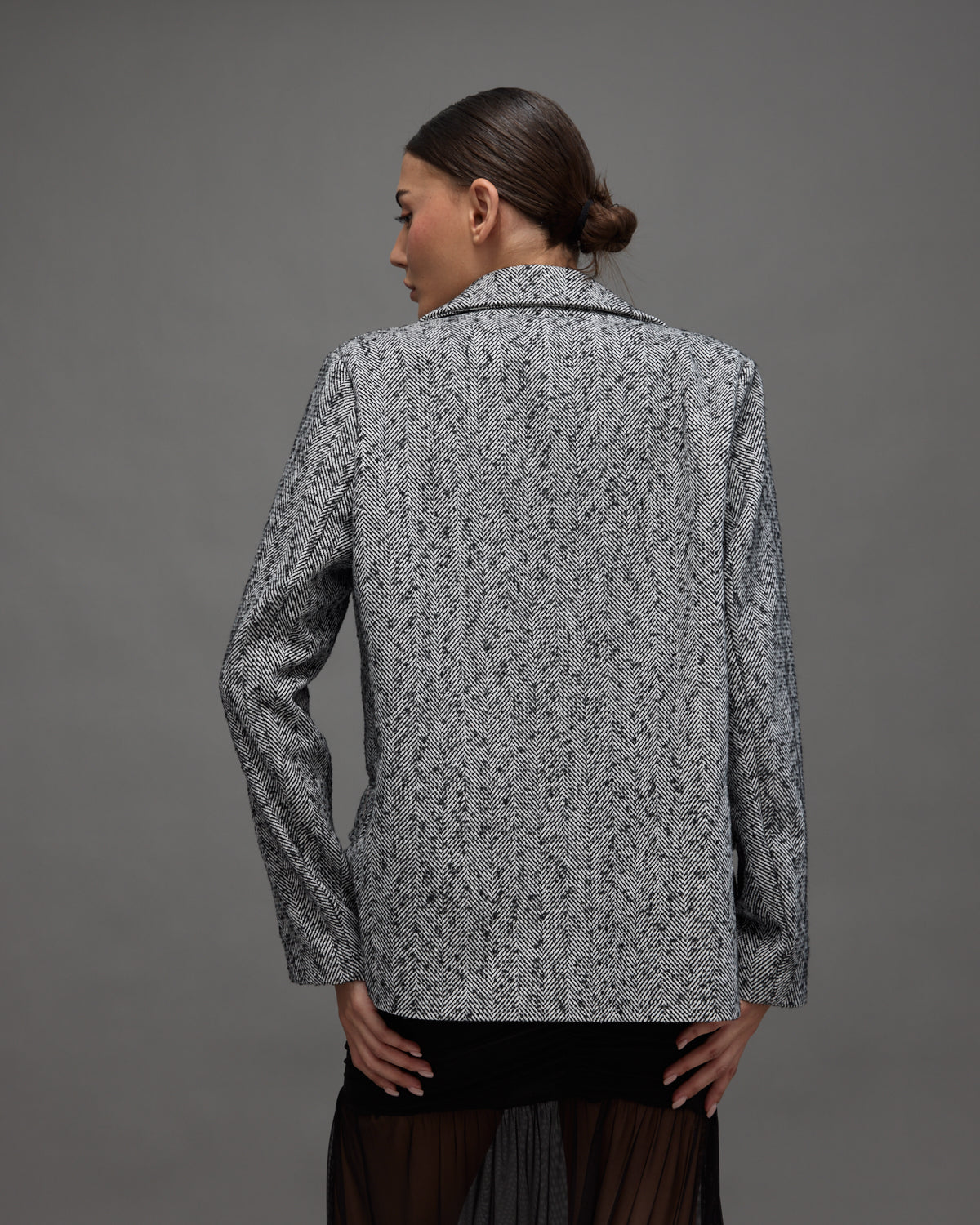 - בלייזר קלאסי בדוגמת הרינגבון אפורה, בגזרה מחויטת עם סגירת כפתור אחד, מעניק מראה אלגנטי ומעודכן