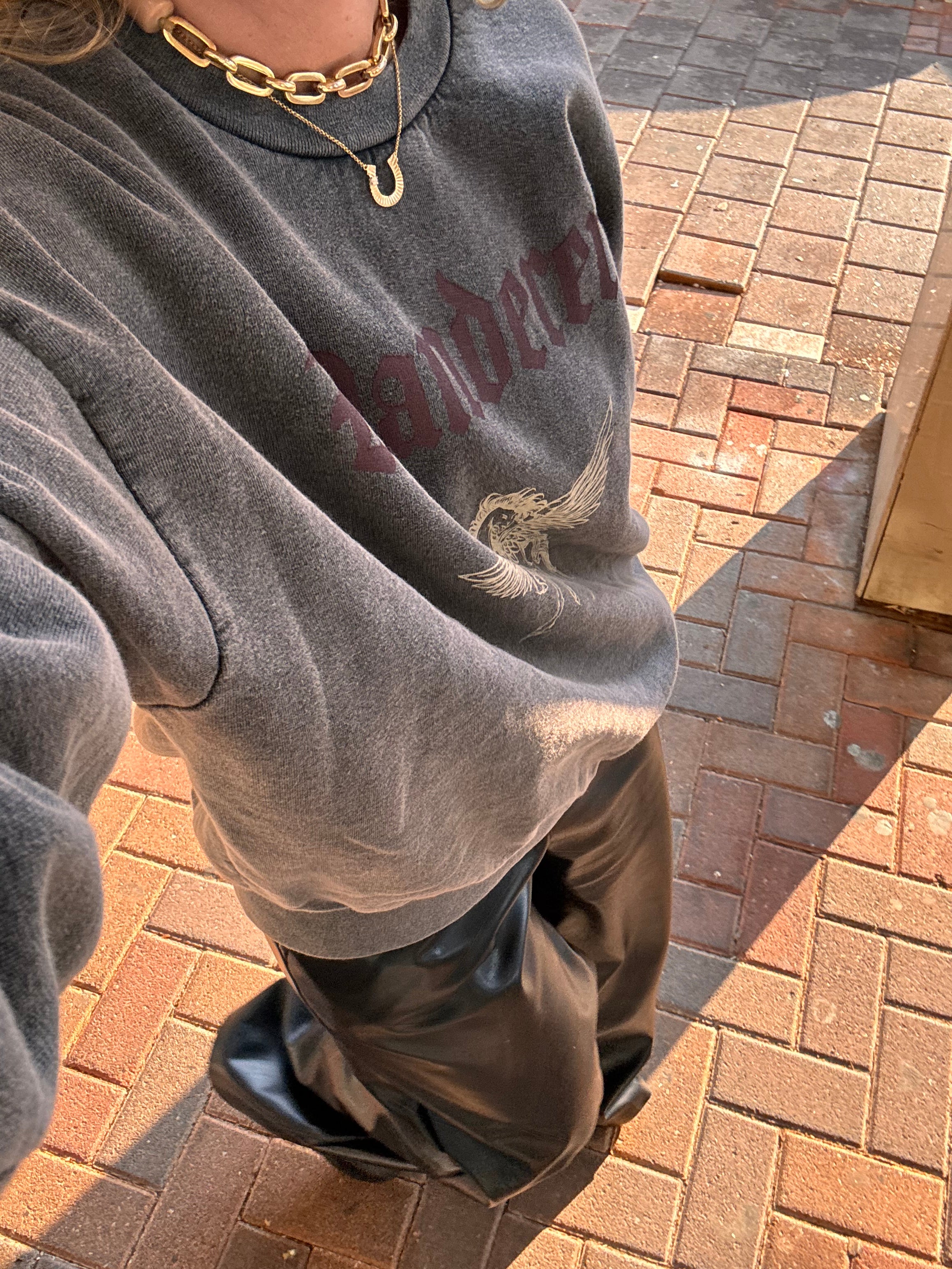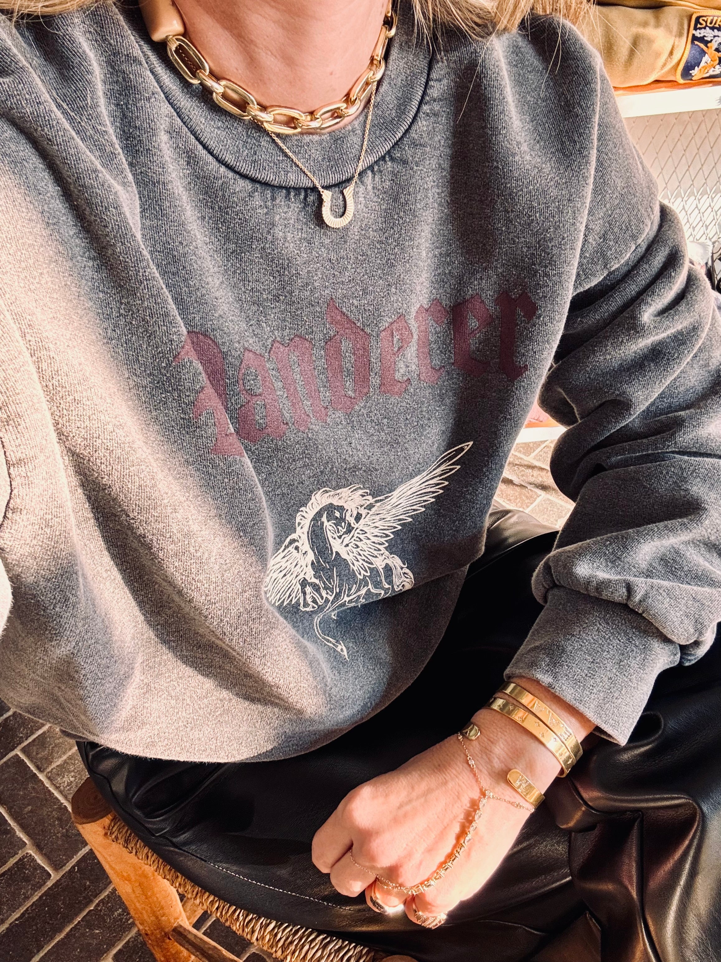 Washed charcoal sweatshirt with bold gothic-style lettering and a striking winged-horse emblem. A relaxed, edgy piece with a vintage streetwear feel.