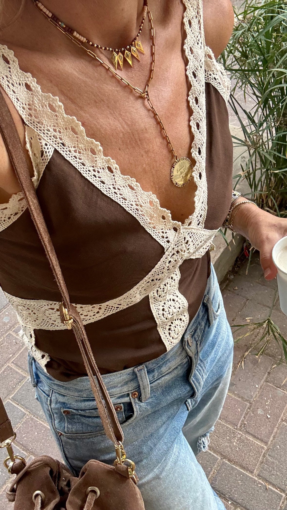 טופ קמיסול חום עם תחרה עדינה בצבע קרם, משדר מראה אלגנטי אך קליל, מושלם ליום יום או ליציאה