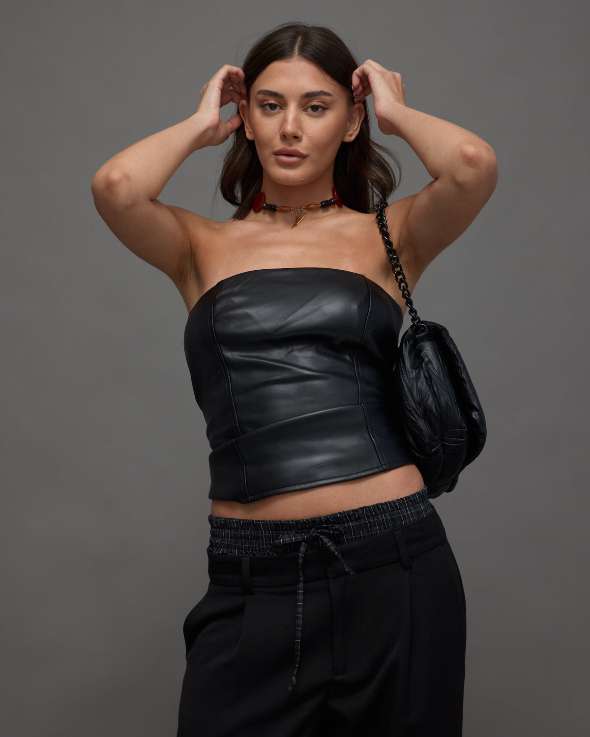 • מחוך עור סטרפלס בצבע שחור עם תפרים מחמיאים, מעניק מראה נועז ועכשווי.