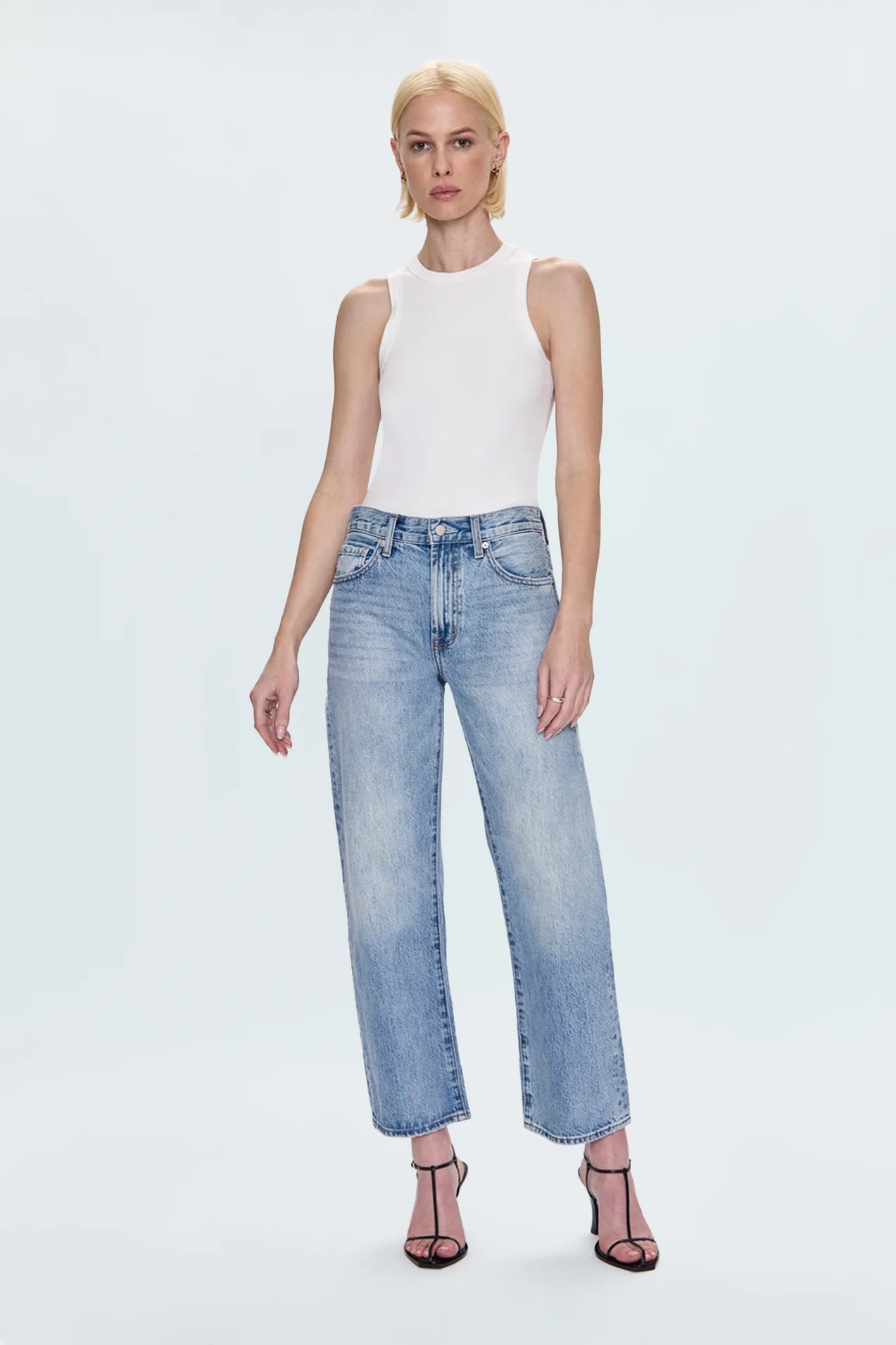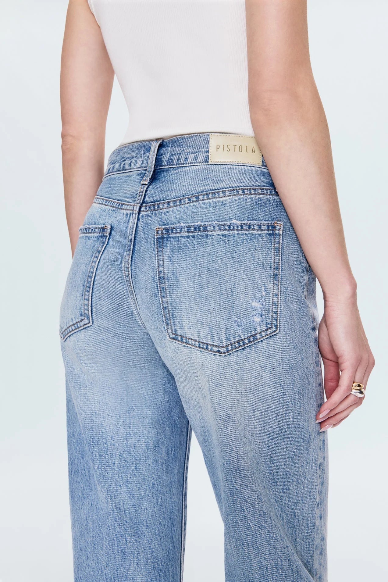 Mid-rise, with a straight leg that bows at the knees for an arched, barrel leg silhouette. Ankle length crop with a clean hem. Bowie is a light wash with lived in fading around the knees and thighs.