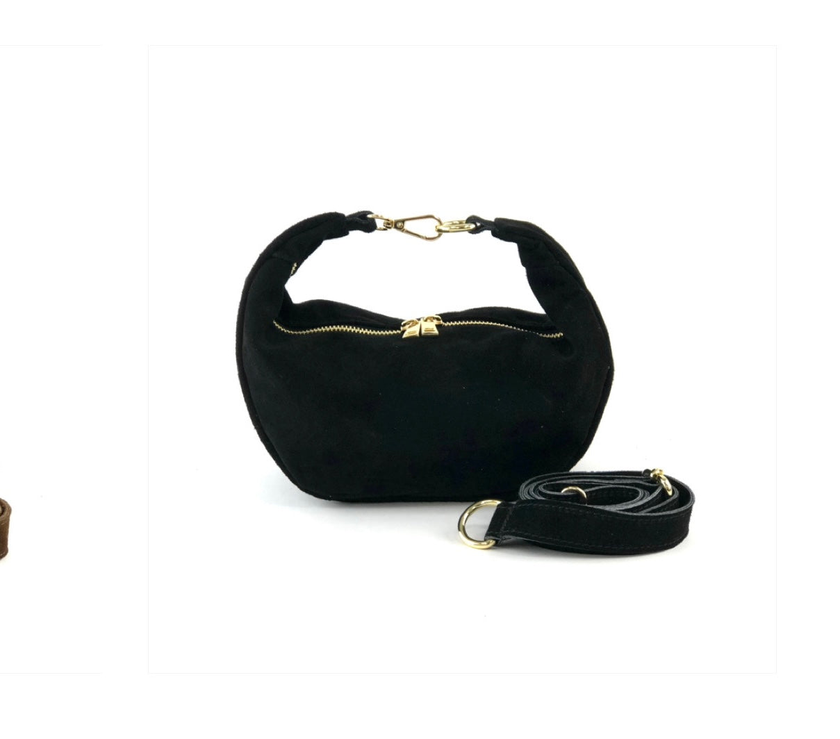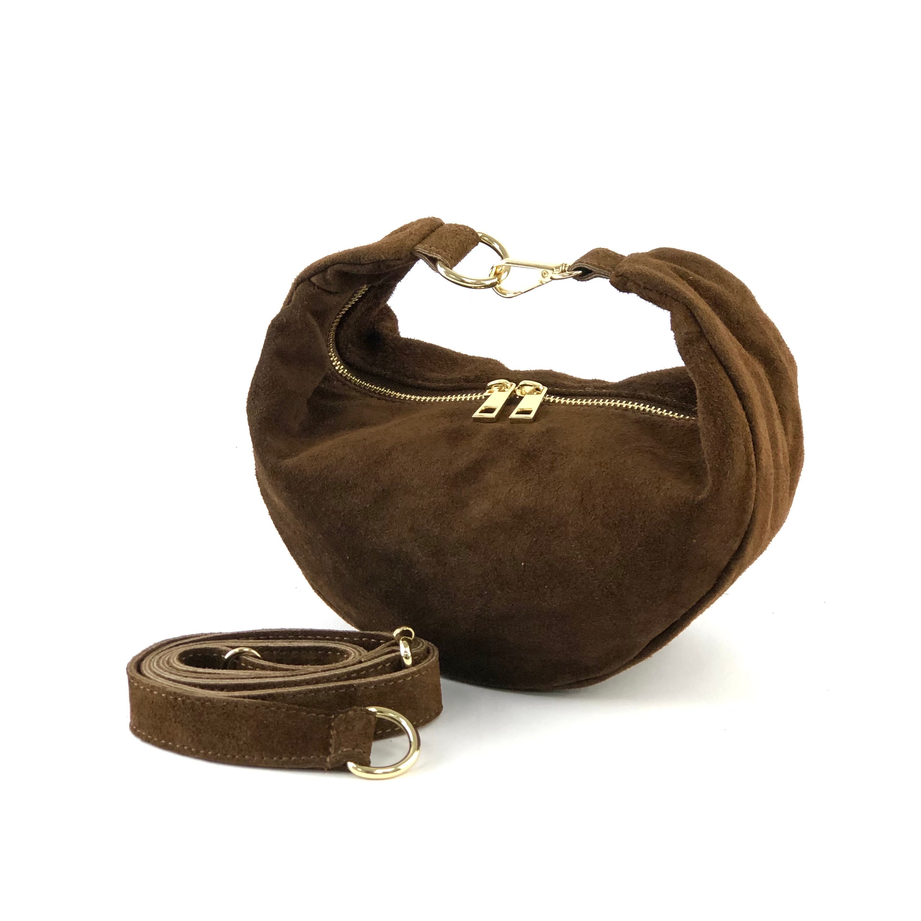 Chic crescent-shaped suede shoulder bag, Designed with a soft curved silhouette, gold-tone zipper closure, and detachable strap for versatile carrying. Perfect for everyday style with a touch of elegance.