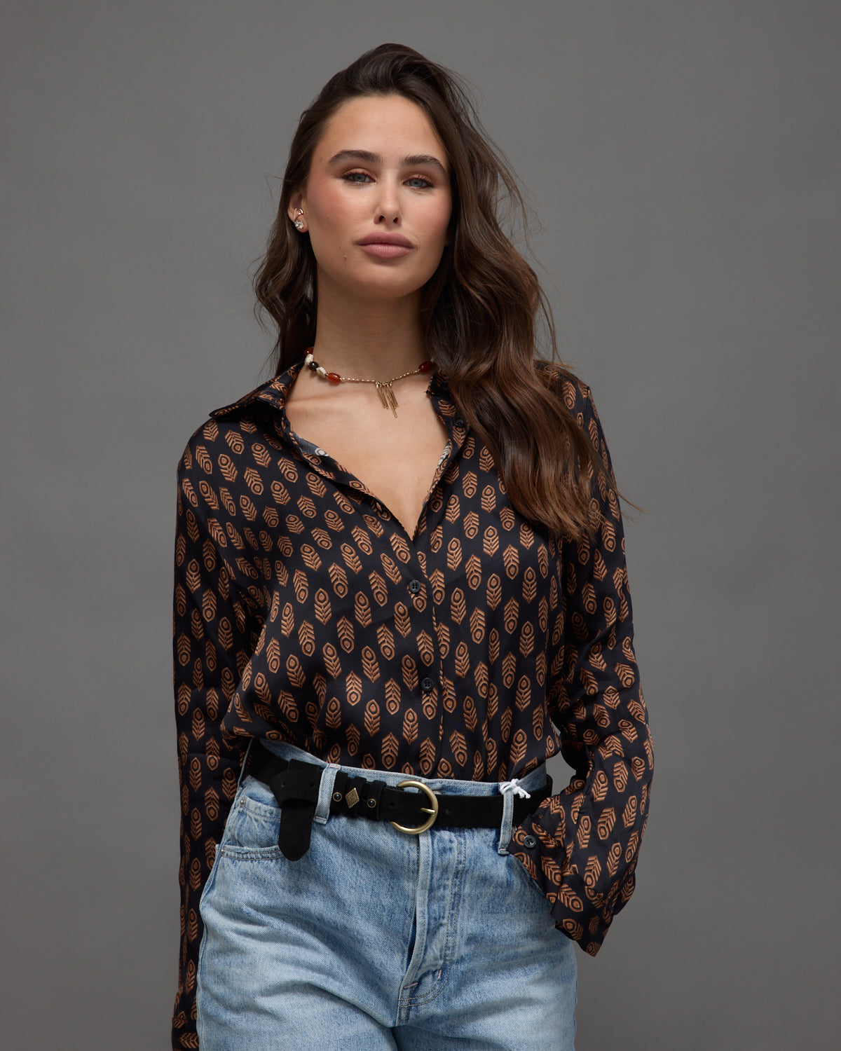 - A lightweight black blouse with an all-over geometric pattern and button-up front, perfect for a chic casual look.