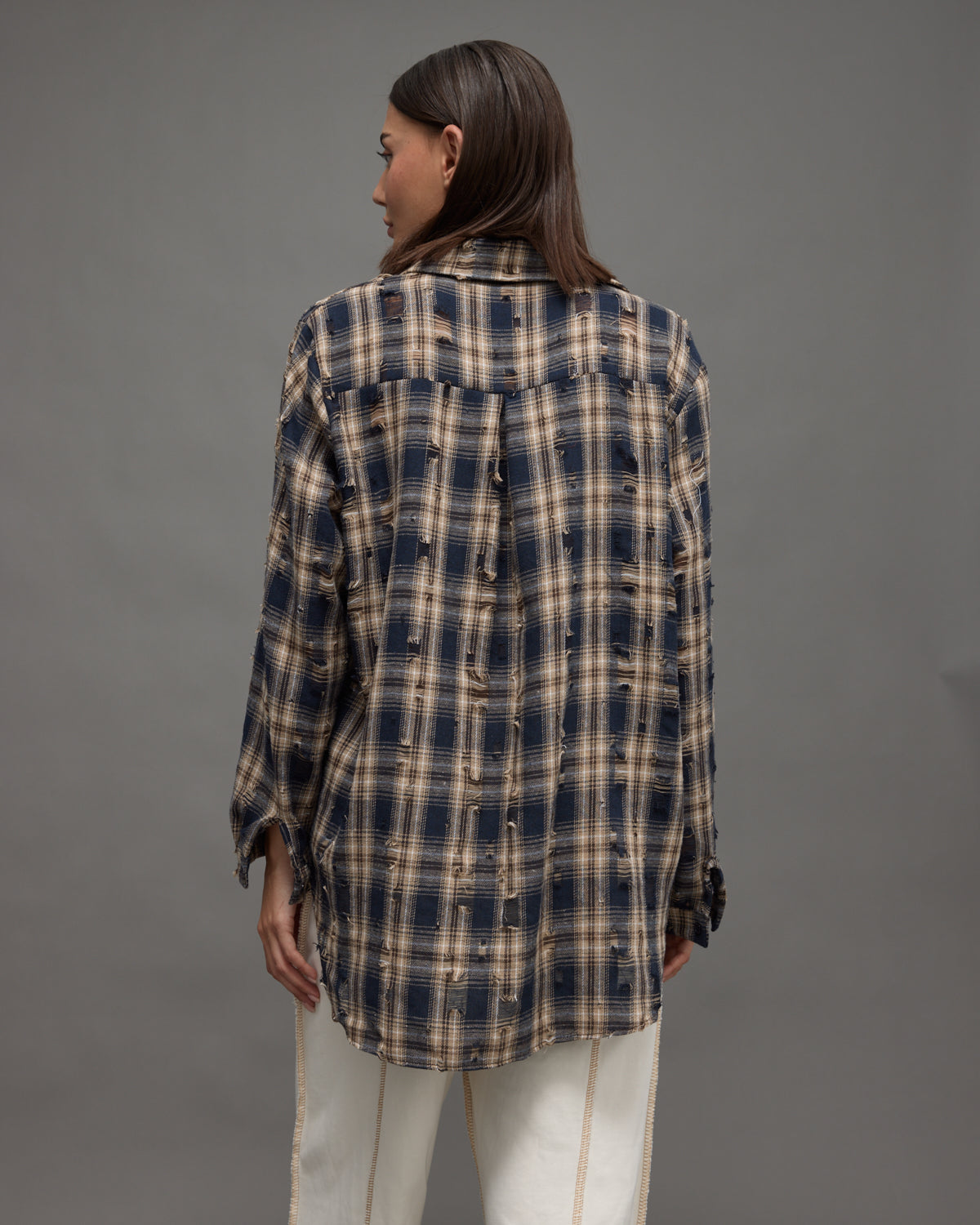 Oversized checkered shirt in beige and navy tones, crafted from lightweight fabric. Perfect for a laid-back yet urban everyday look.