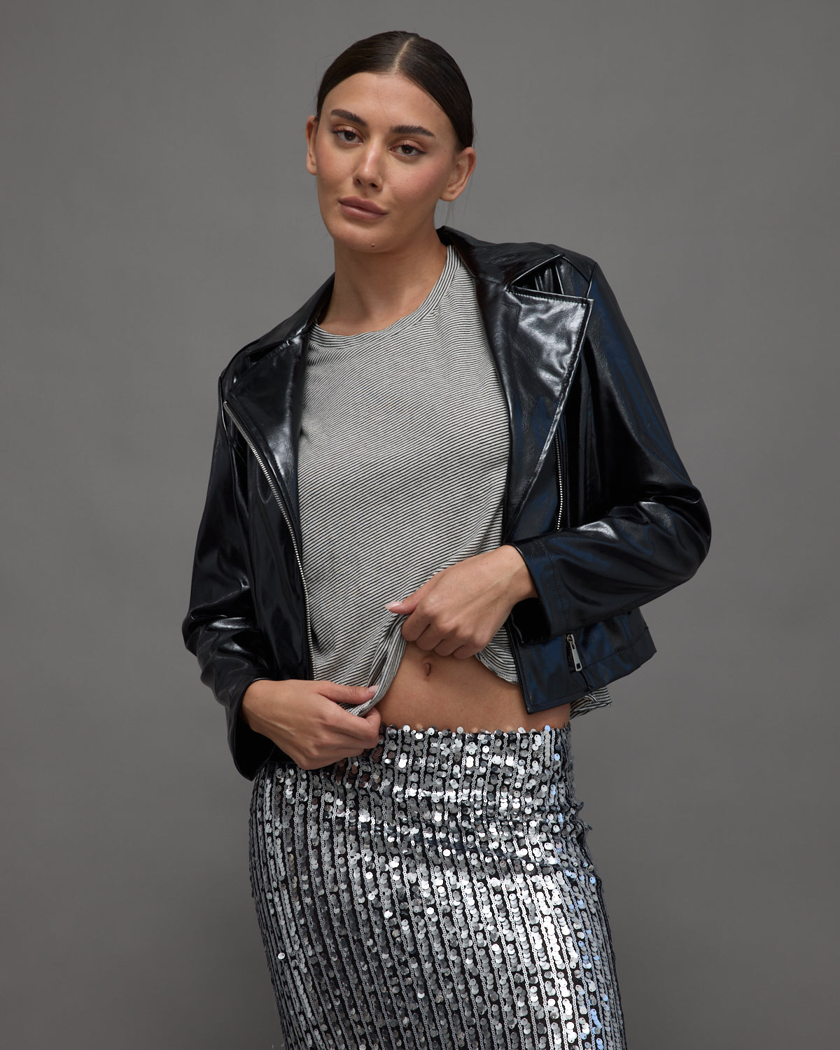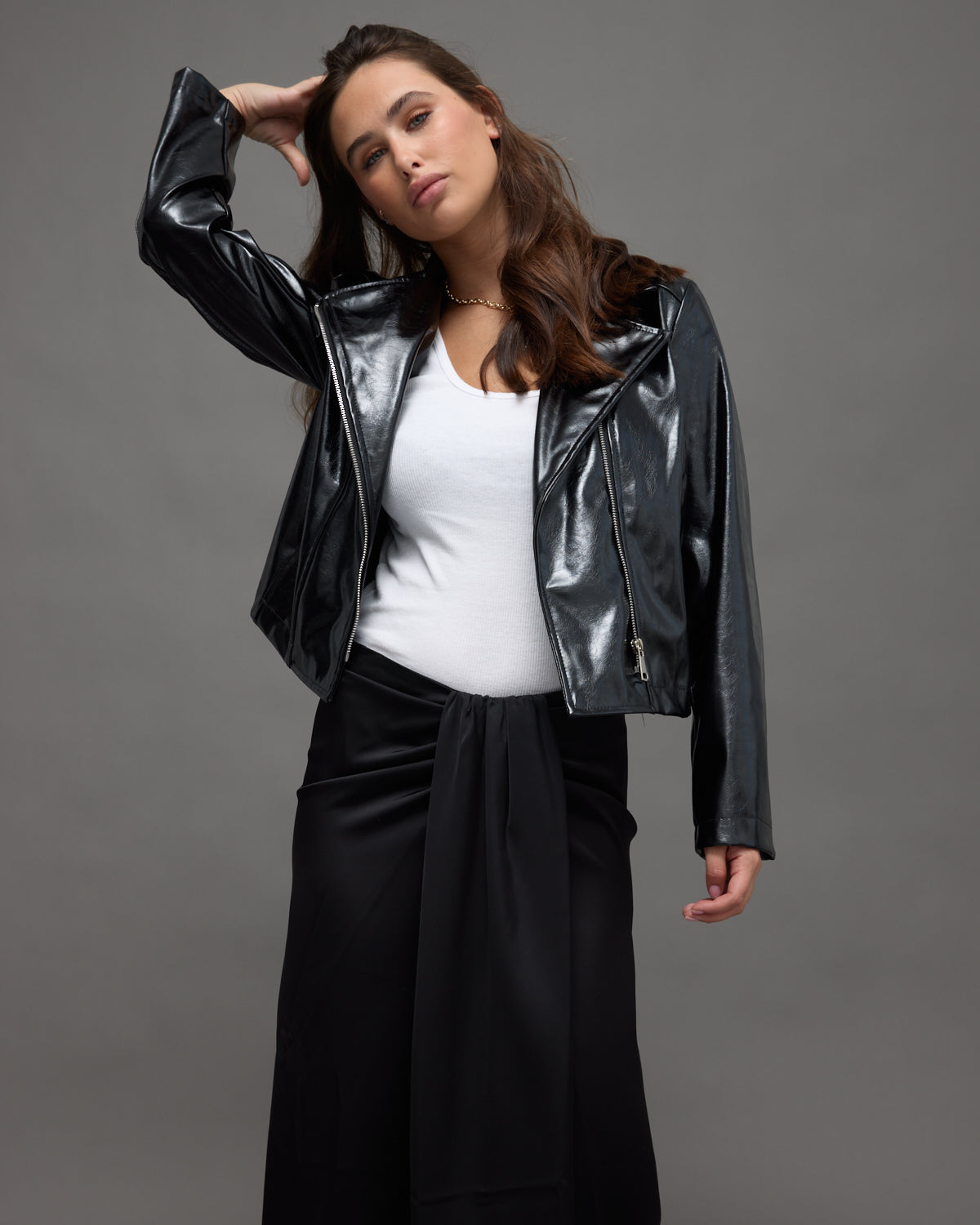 תיאור: ג׳קט קצר ואופנתי ריץרץ במראה עור מבריק, קליל ונוח לשילוב יומיומי או לערב.