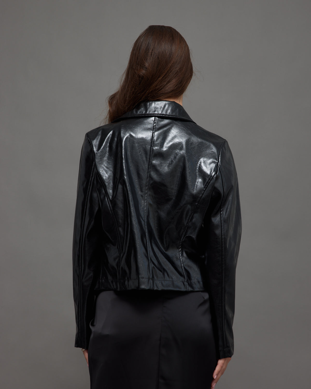 A stylish zipper jacket with a glossy leather-like finish, lightweight and versatile for day or night looks.