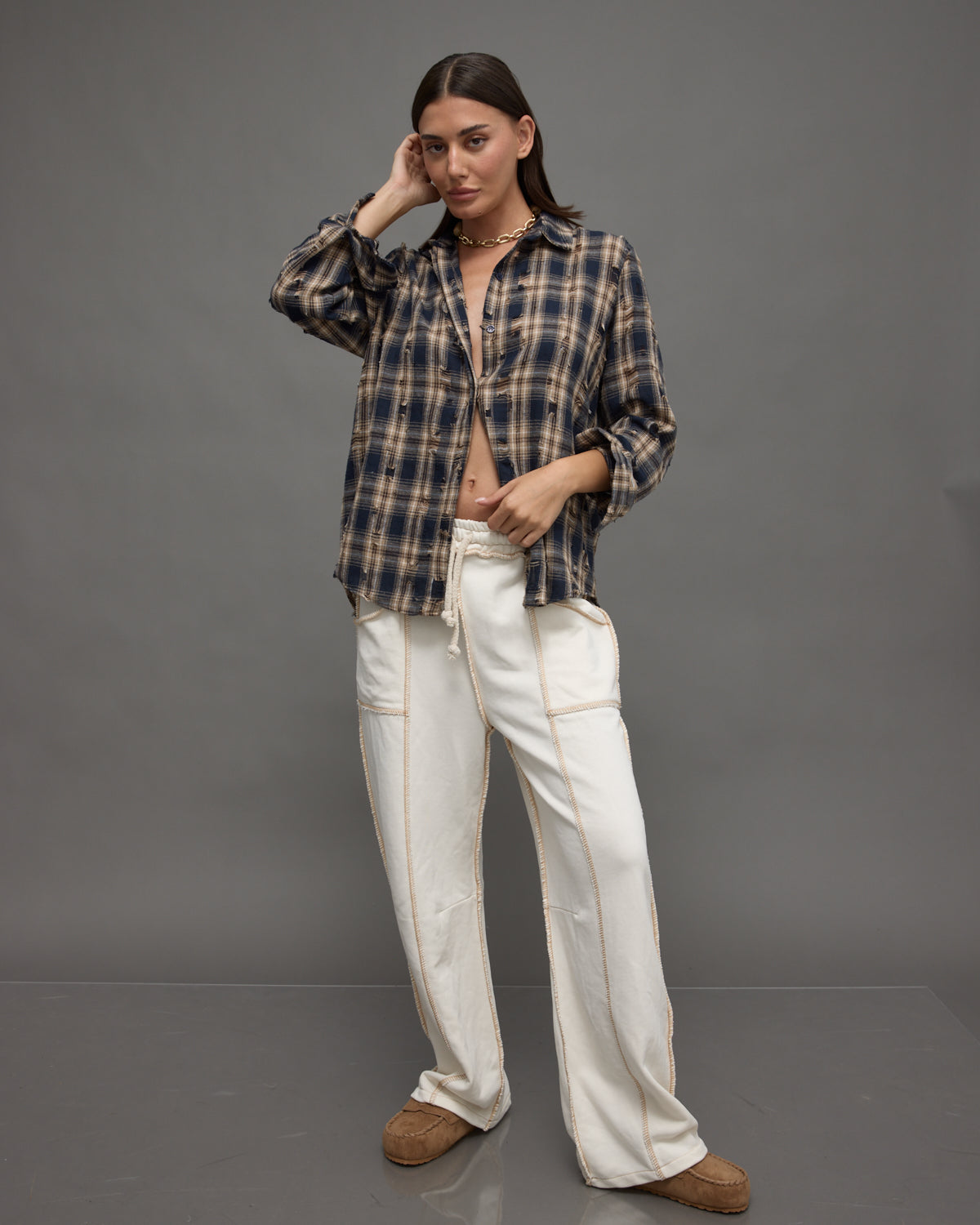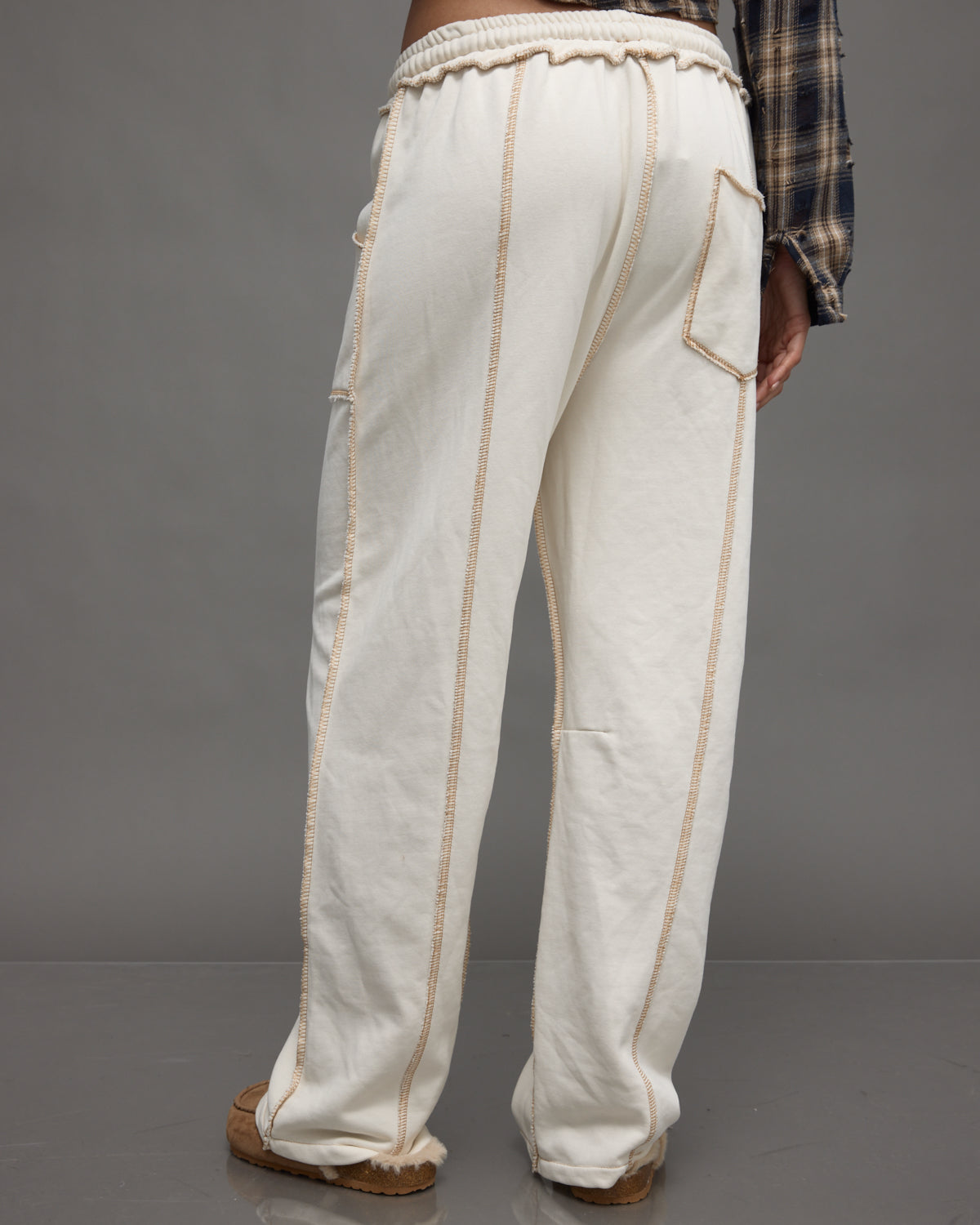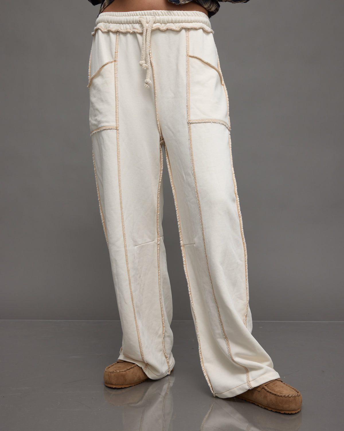- עברית: מכנסי טרנינג שמנת עם תפרים דקורטיביים חשופים בגזרה רחבה ונוחה, מושלמים ללוק יומיומי רגוע.