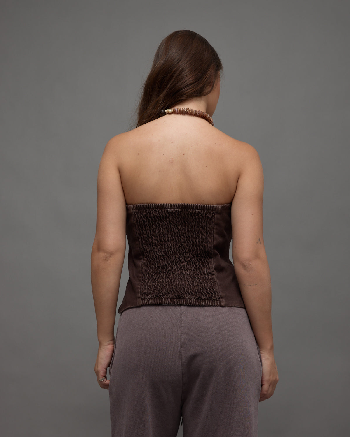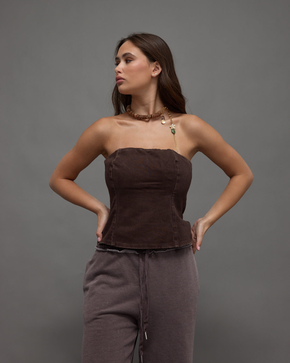 - A brown strapless denim corset-style top with raw hem detailing, blending structure with a casual edge.