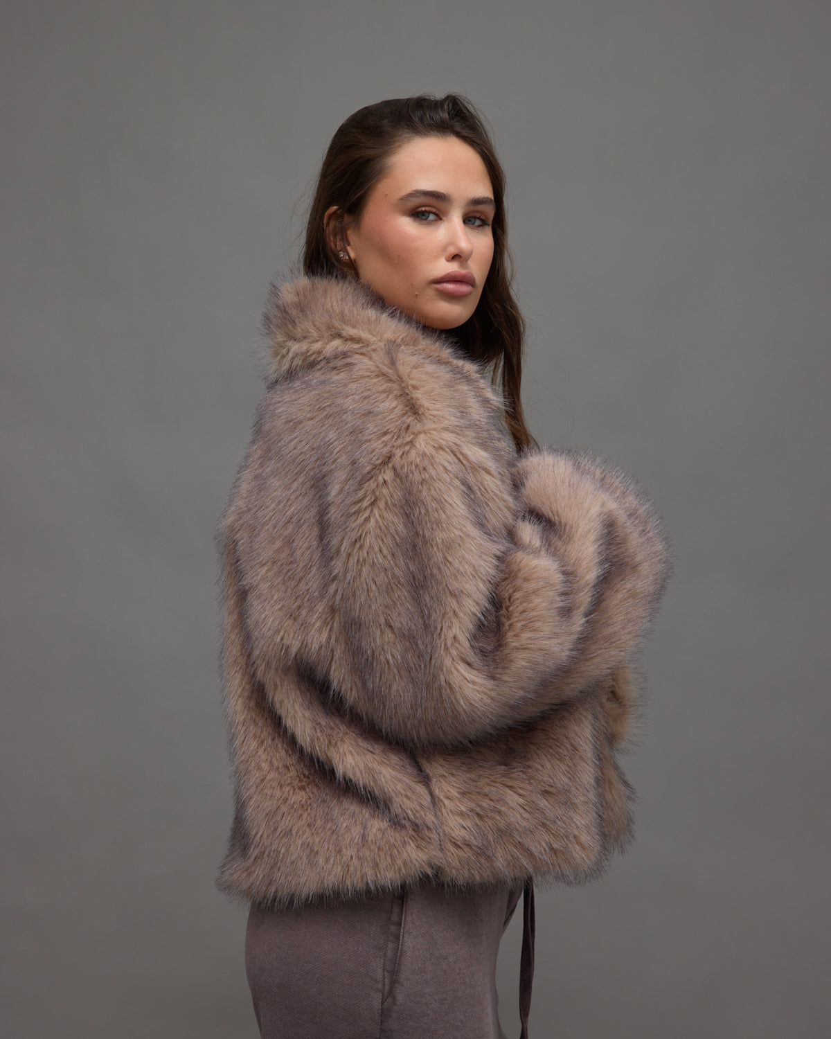 A chic faux fur coat in a soft natural shade, combining warmth with refined elegance. The classic checkered lining inside adds a sophisticated and timeless detail, perfect for elevating any look.