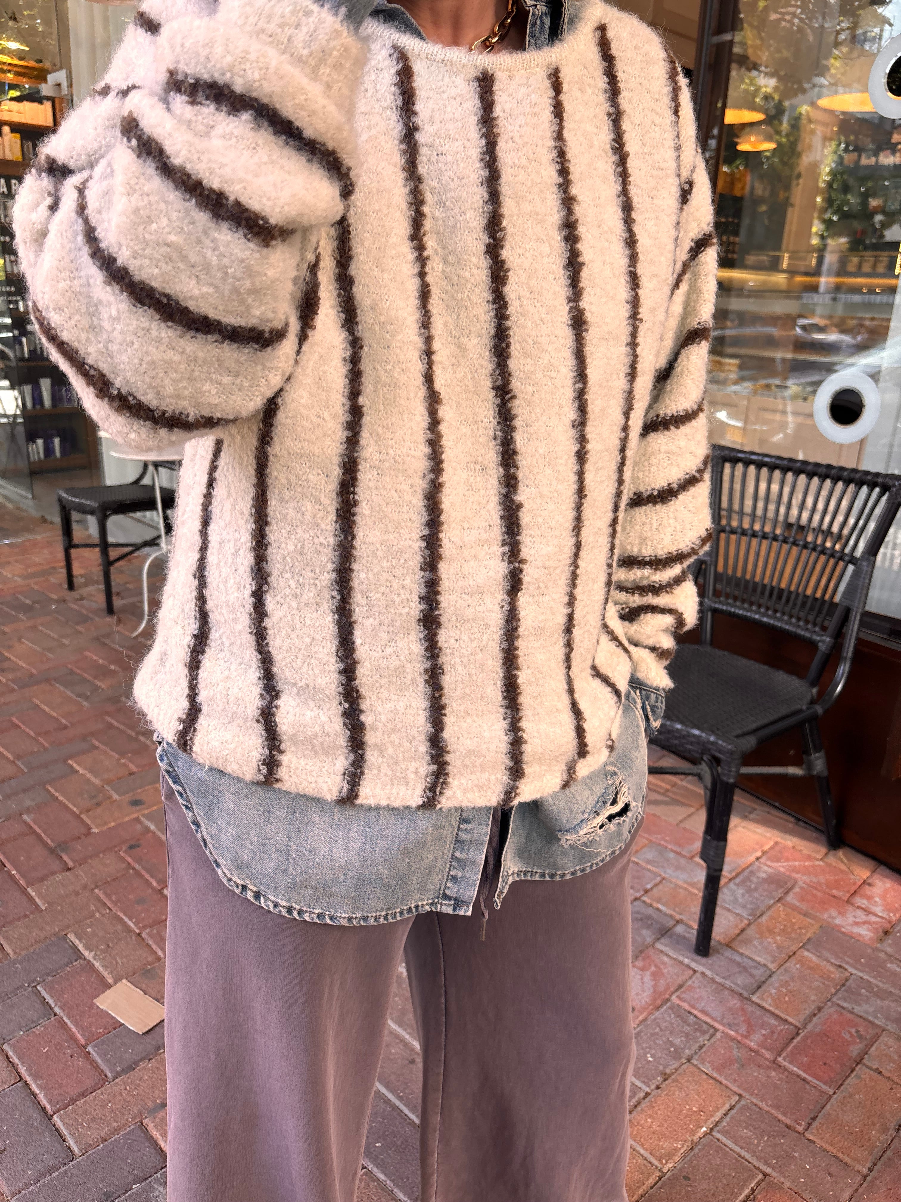 A plush, textured knit with clean vertical stripes, layered effortlessly over denim for a relaxed yet refined look. Soft, warm, and undeniably stylish