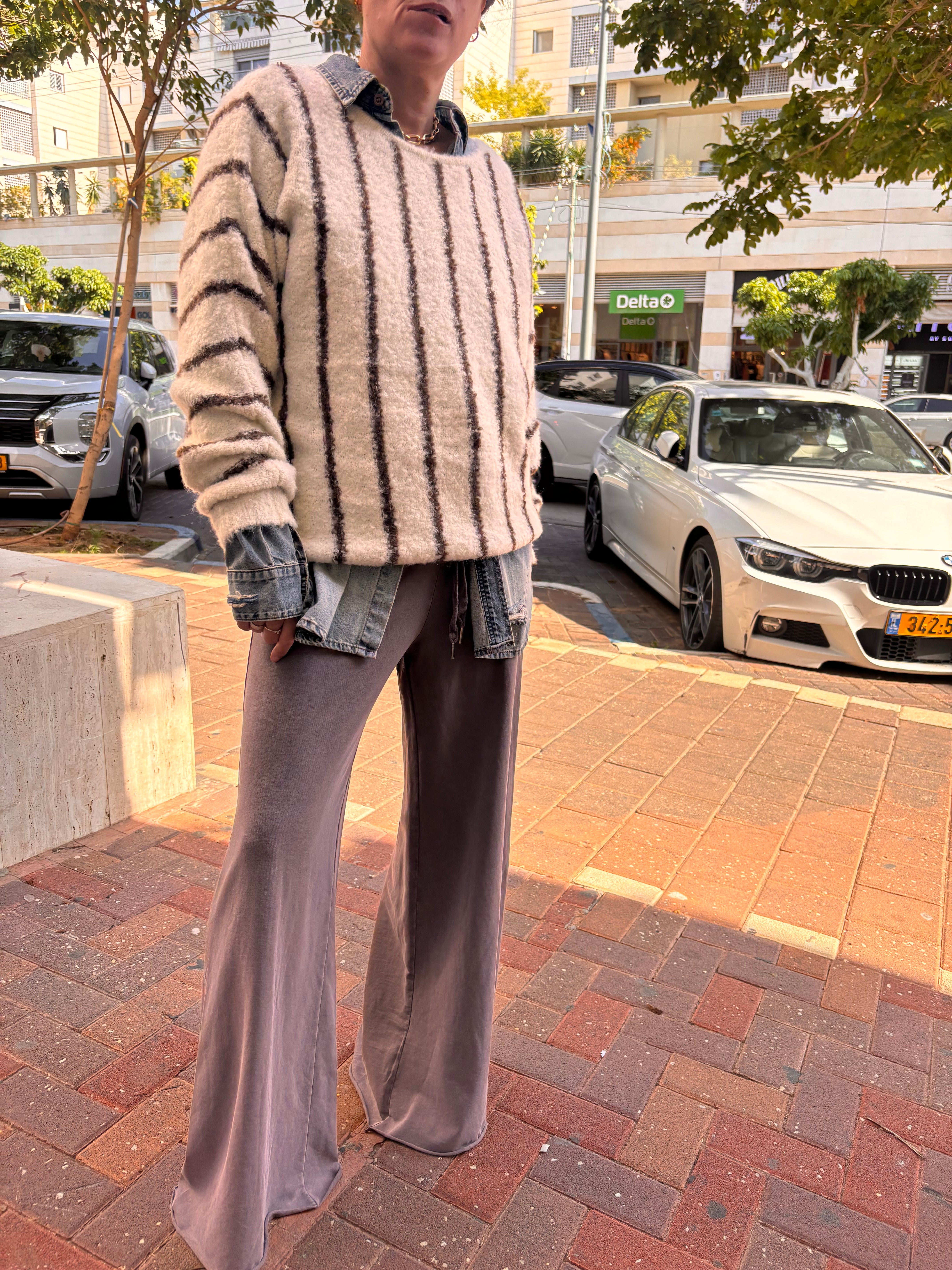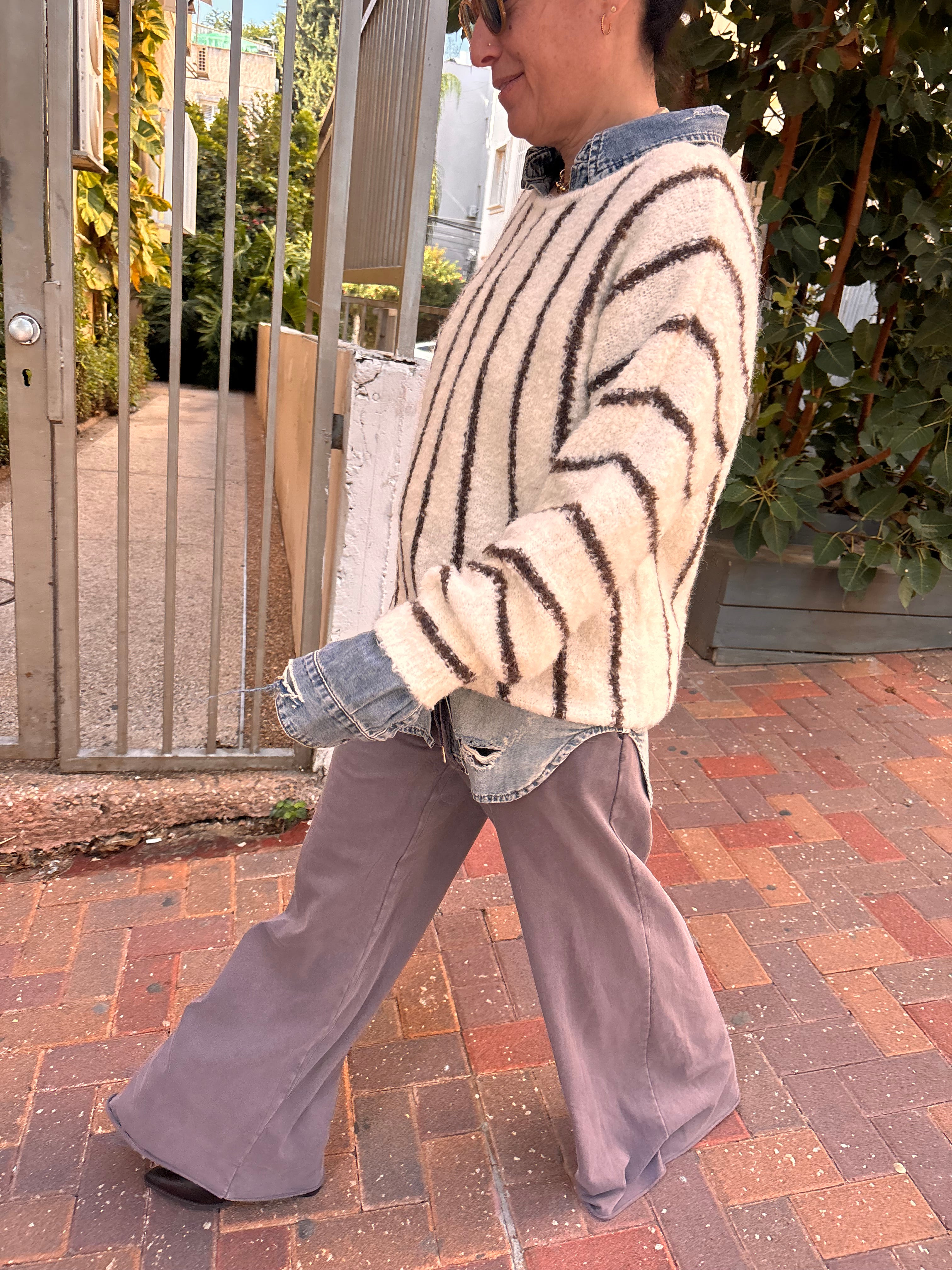 סריג רך ובעל טקסטורה עשירה עם פסים אנכיים נקיים, משולב בקלילות מעל ג’ינס למראה נינוח אך מתוחכם. חמים, נעים וסופר סטייל.