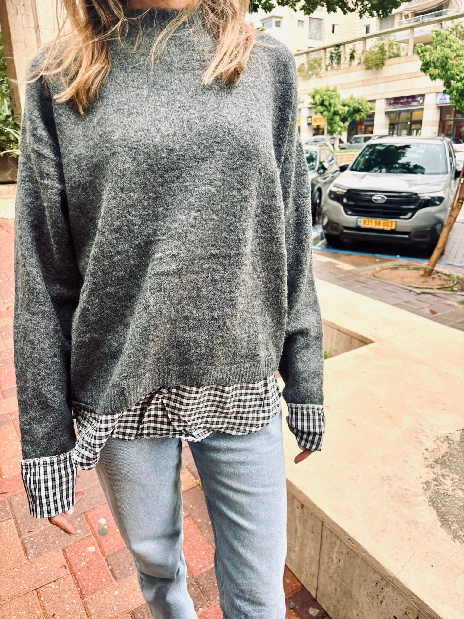 סריג נעים עם מראה שכבות, הכולל סריג רך בשילוב חפתים ושולי חולצה משובצת. הגב הפתוח מוסיף תנועה וסטייל מודרני למראה יומיומי מושלם
