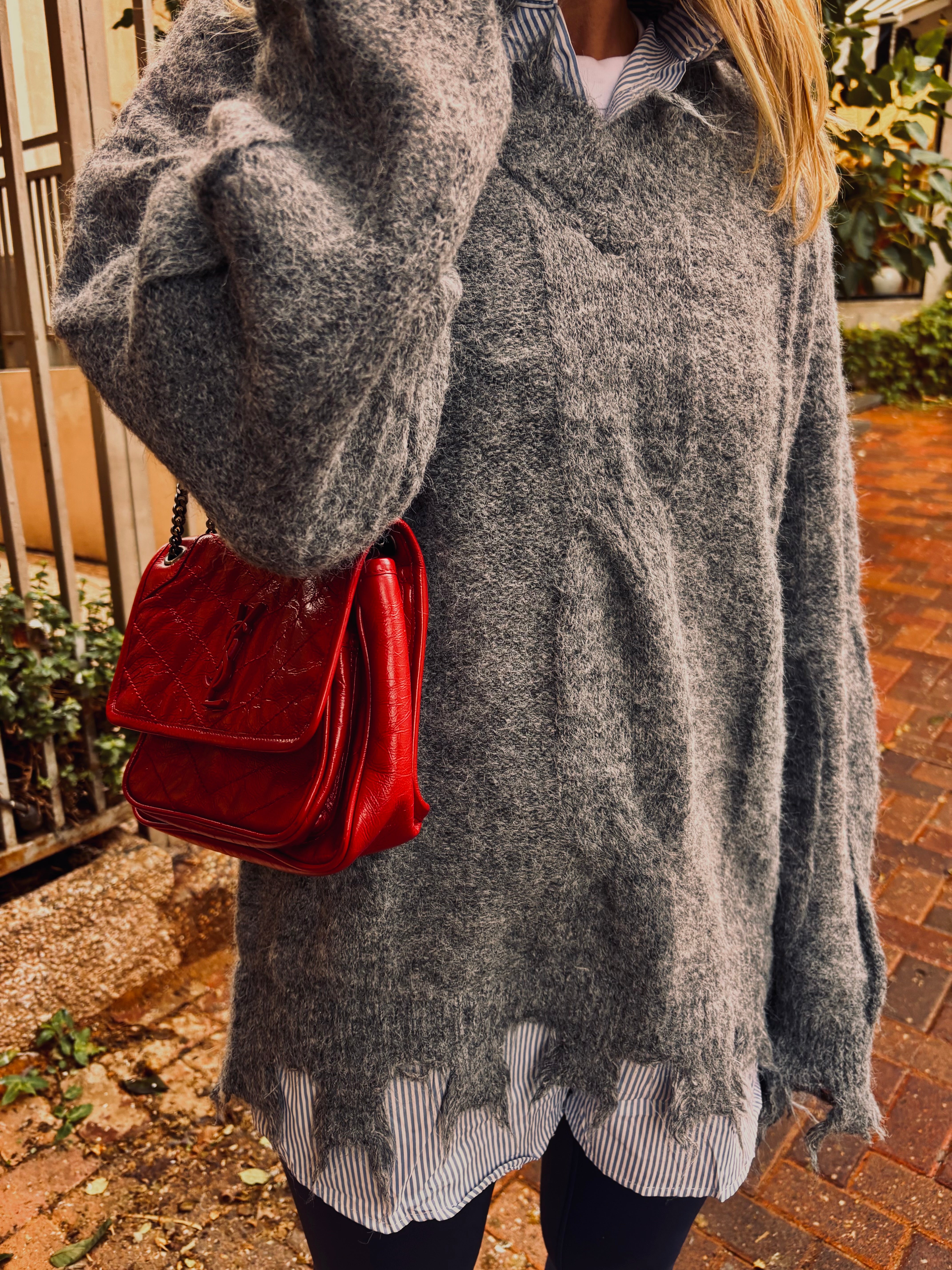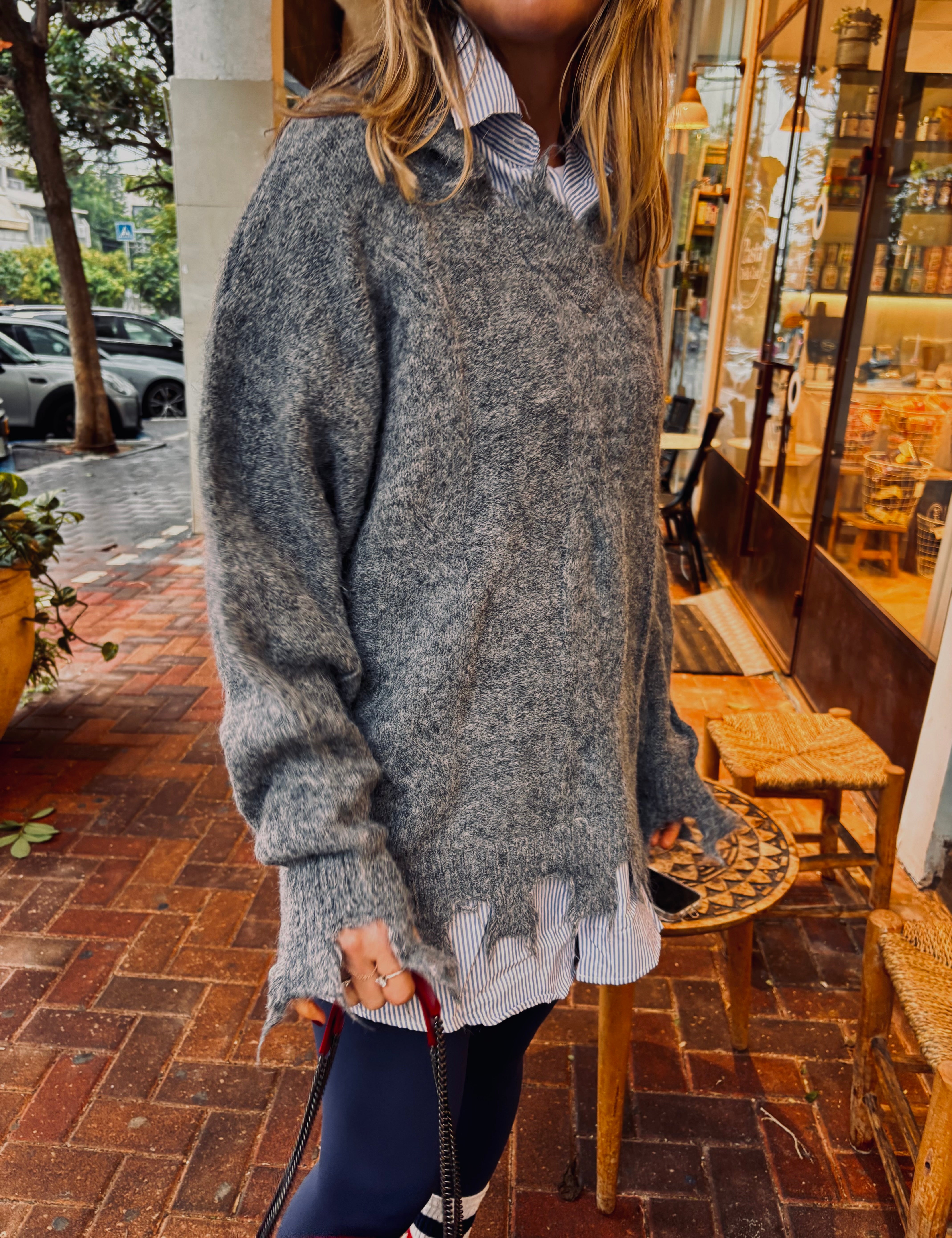 סריג רך ונעים עם מראה שכבות מובנה – משולב עם מכופתרת צווארון פסים תכלת לבן מובנית מלמטה לסטייל מתוחכם ולא מתאמץ. גימורי קרעים עדינים מוסיפים טאץ’ אדג’י וסטיילי, ויוצרים פריט ייחודי שמשלב קלאסיות עם טוויסט עכשווי. מתאים ללוק יומיומי עם נוכחות