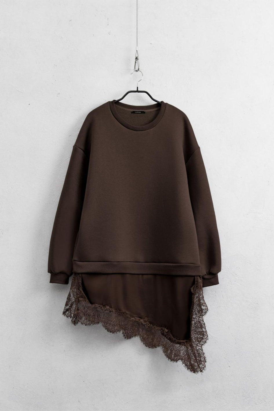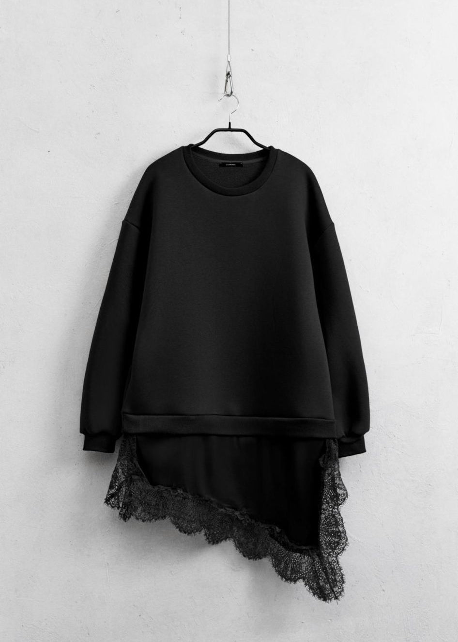 - Oversized black sweatshirt with an asymmetrical lace hem.