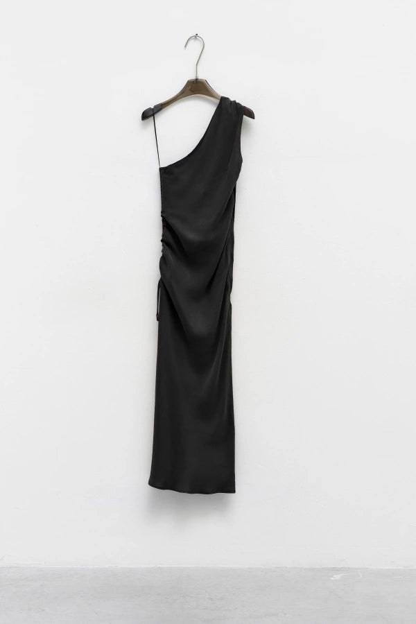 Sleek one-shoulder midi dress with ruched detailing and adjustable side drawstring. Crafted from a smooth satin-like fabric for an effortlessly elegant silhouette—perfect for evening wear or summer nights out.