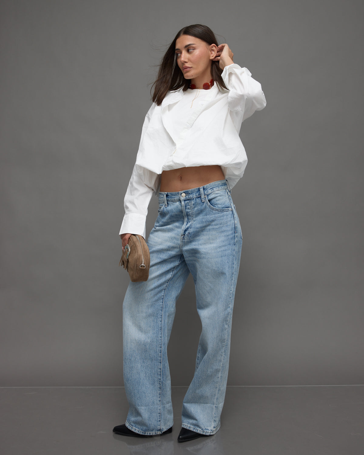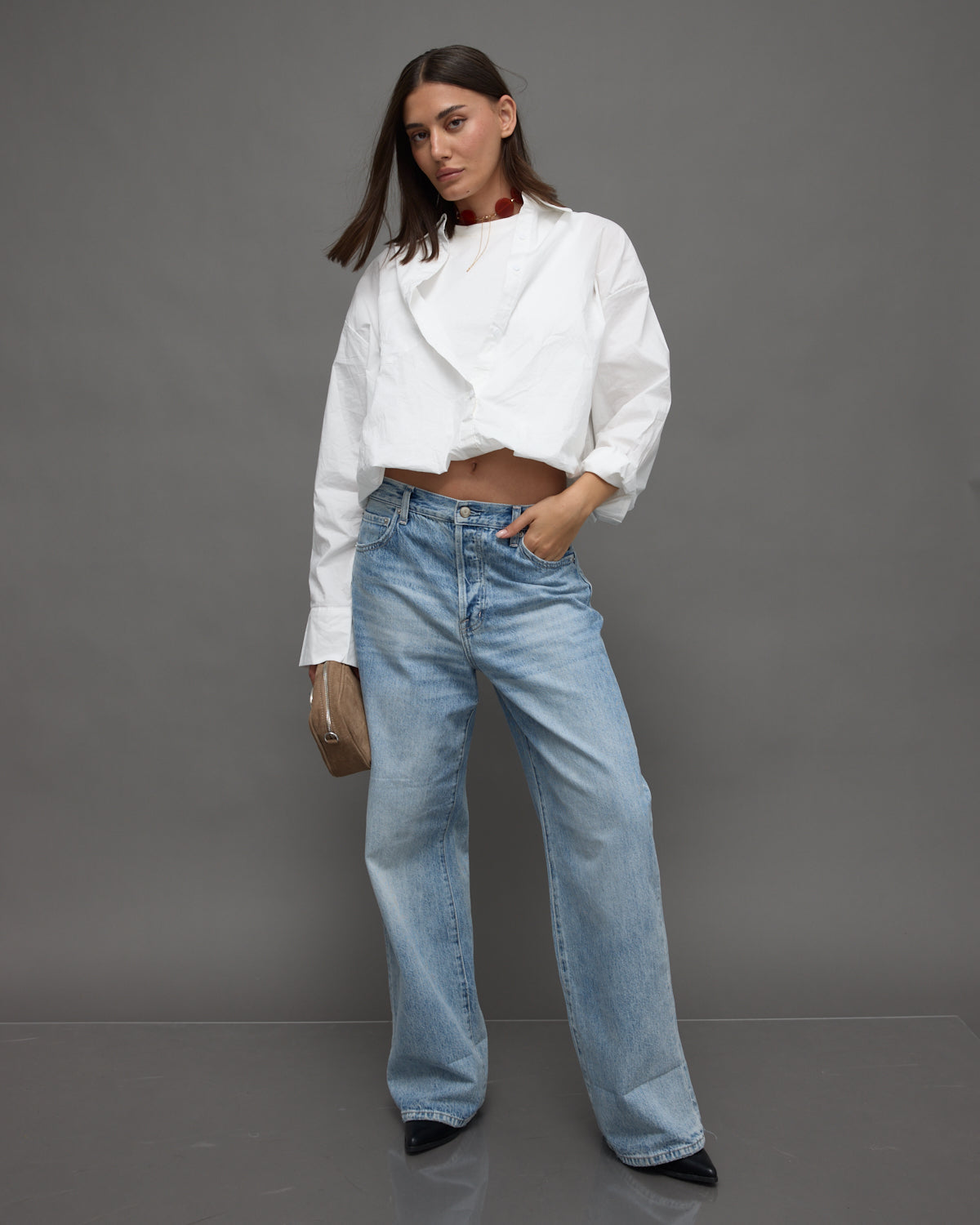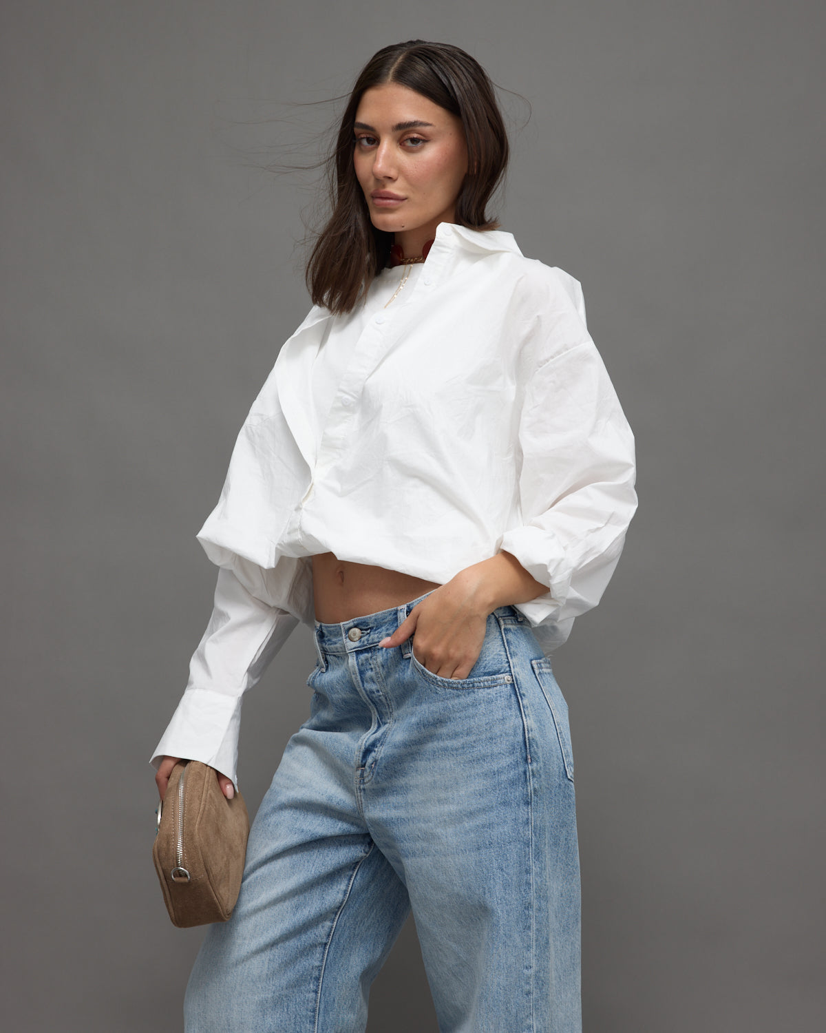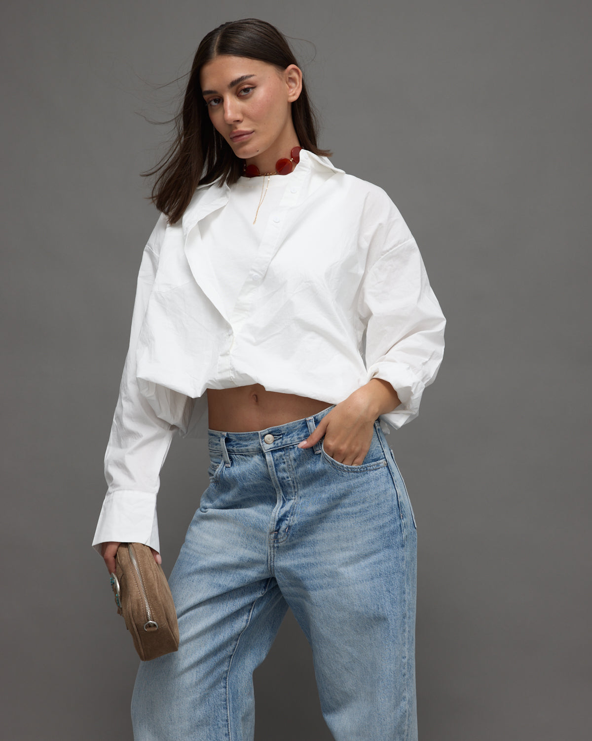 חולצת כפתורים לבנה עם בטנת גופייה פנימית וכיווצים ליצירת מראה בלון מודרני ואופנת