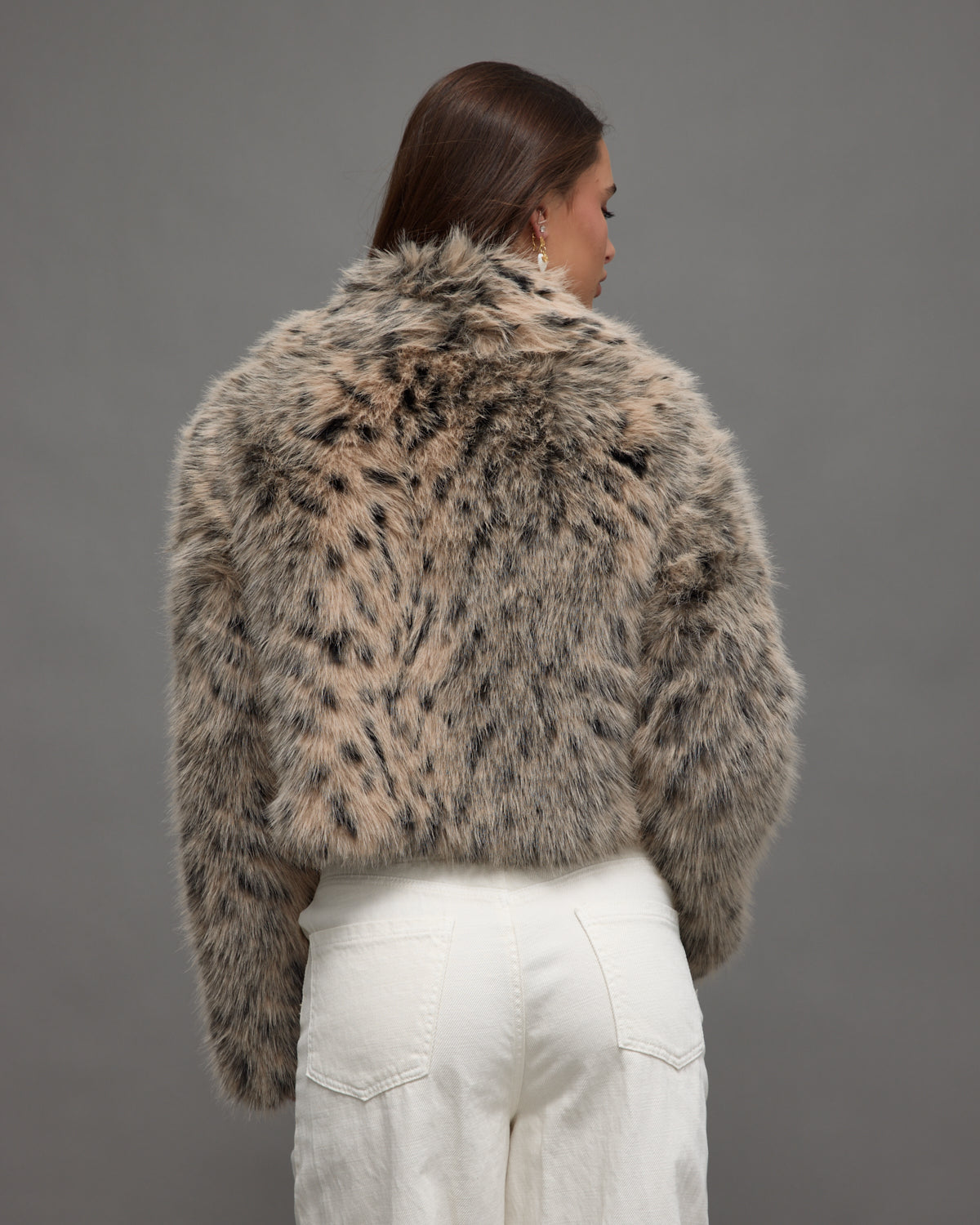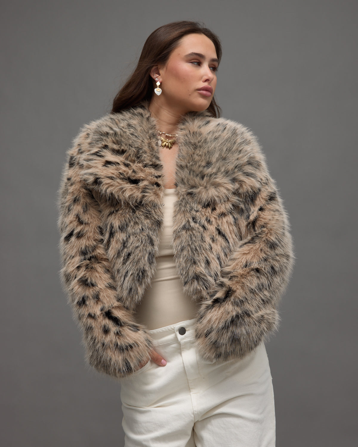 Cropped faux fur jacket with a soft leopard-inspired pattern for a bold and stylish winter look.