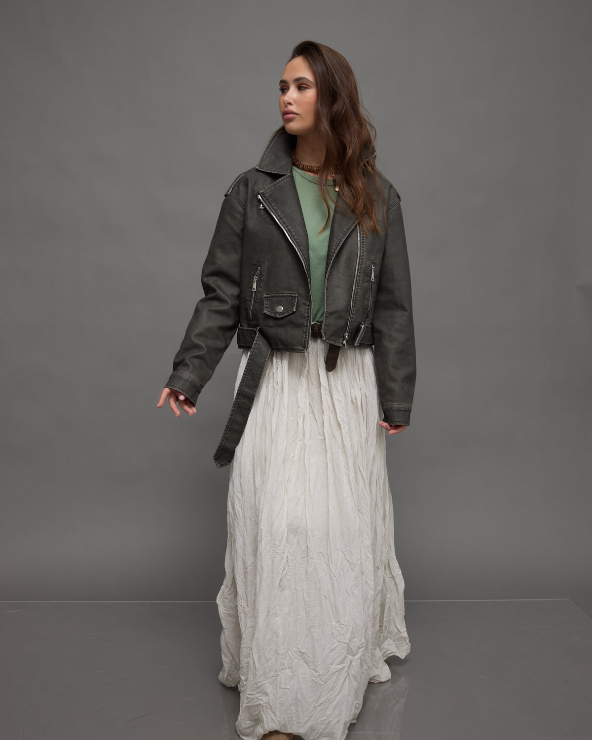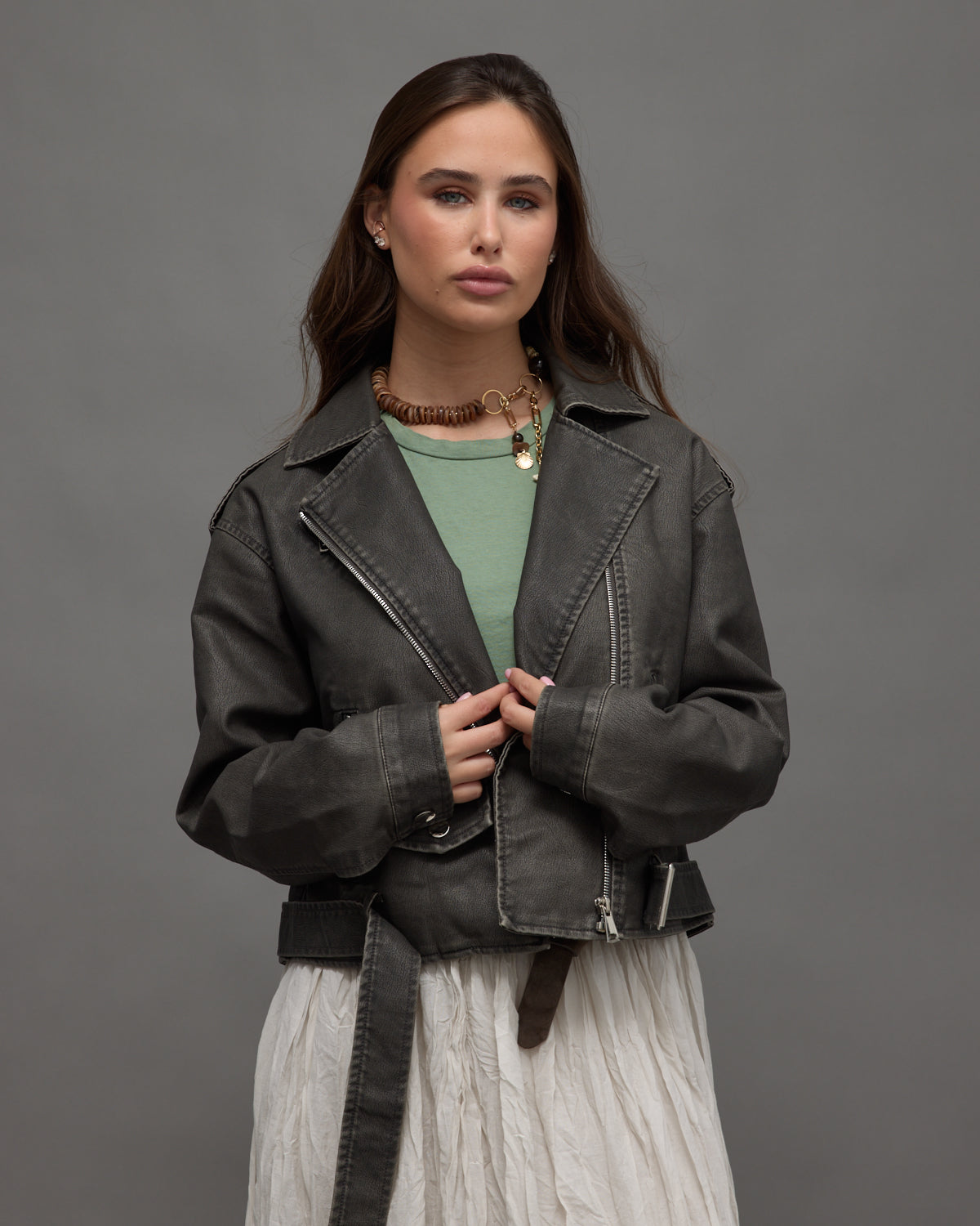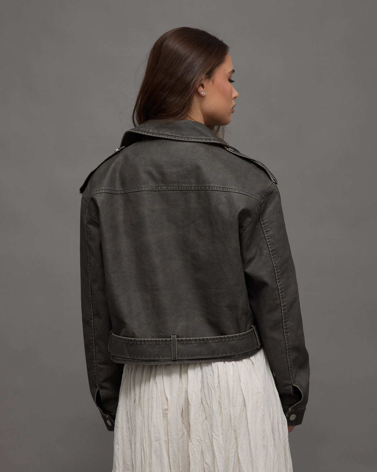ג’קט דמוי עור חום במראה משופשף ואופנתי, עם פרטי בייקר קלאסיים שמעניקים מראה אורבני קליל ושיקי.