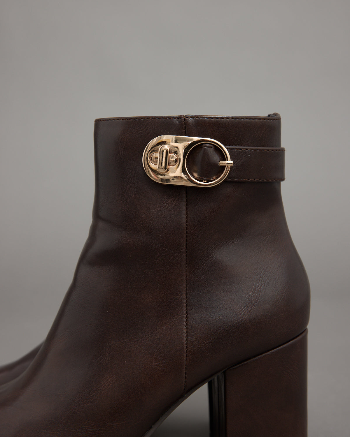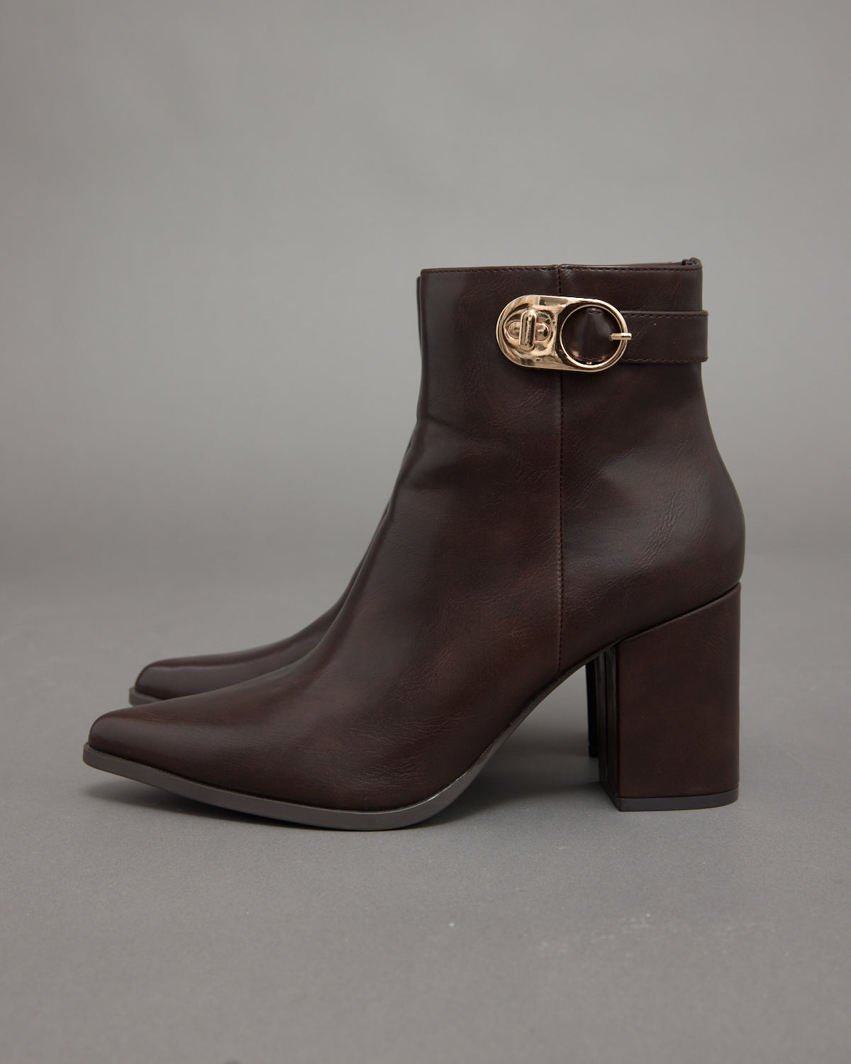 Dark brown vegan leather ankle boots with a pointed toe, block heel, and gold buckle detail