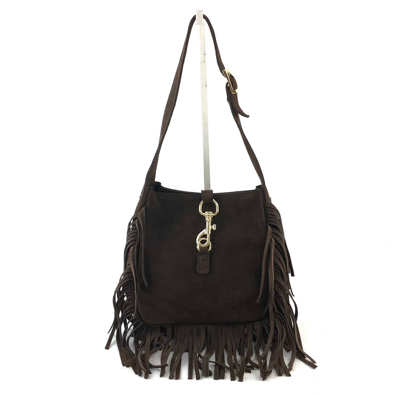 Description: Beige suede shoulder bag with fringe details, gold-tone clasp