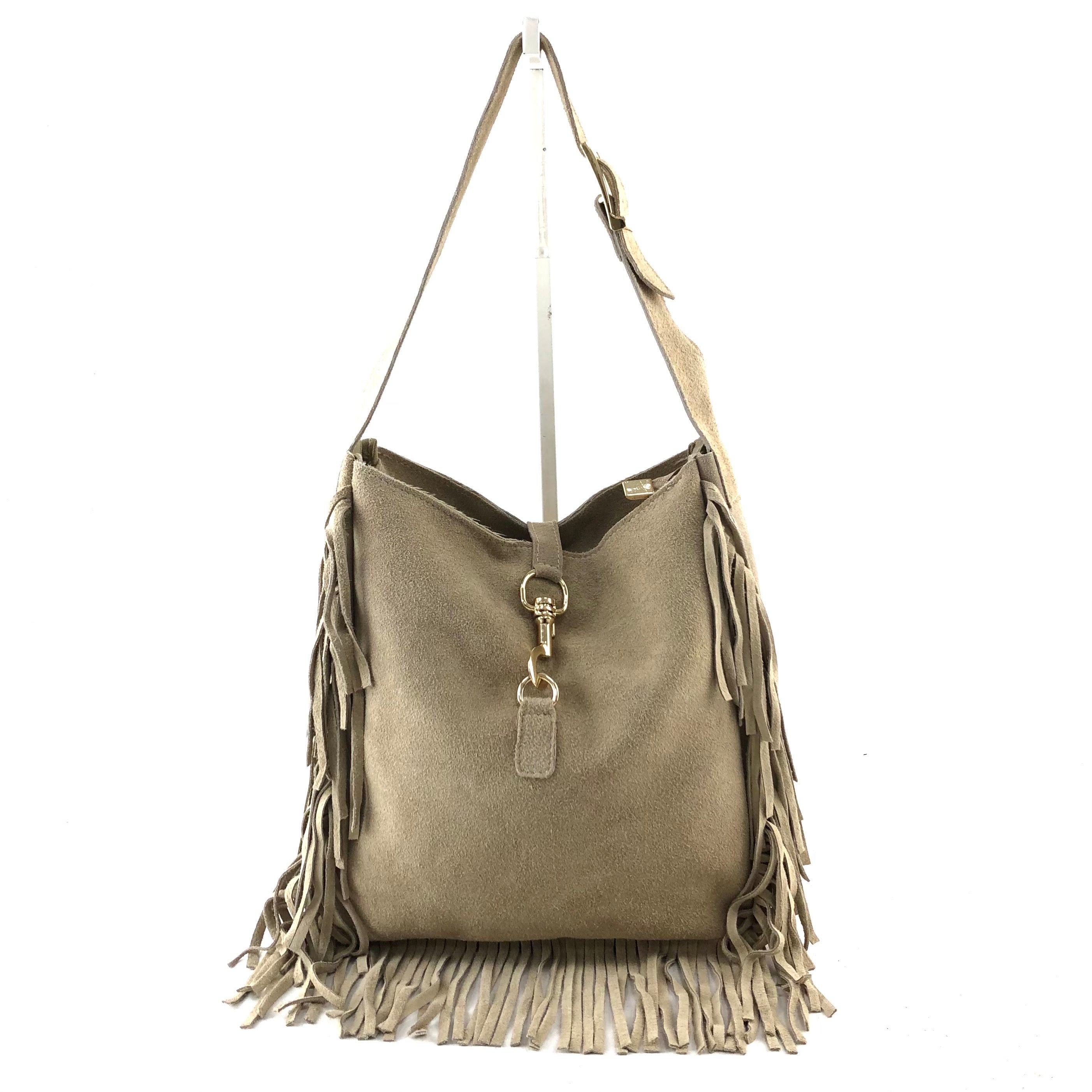 תיק זמש בצבע בז’ עם פרנזים, סוגר מוזהב