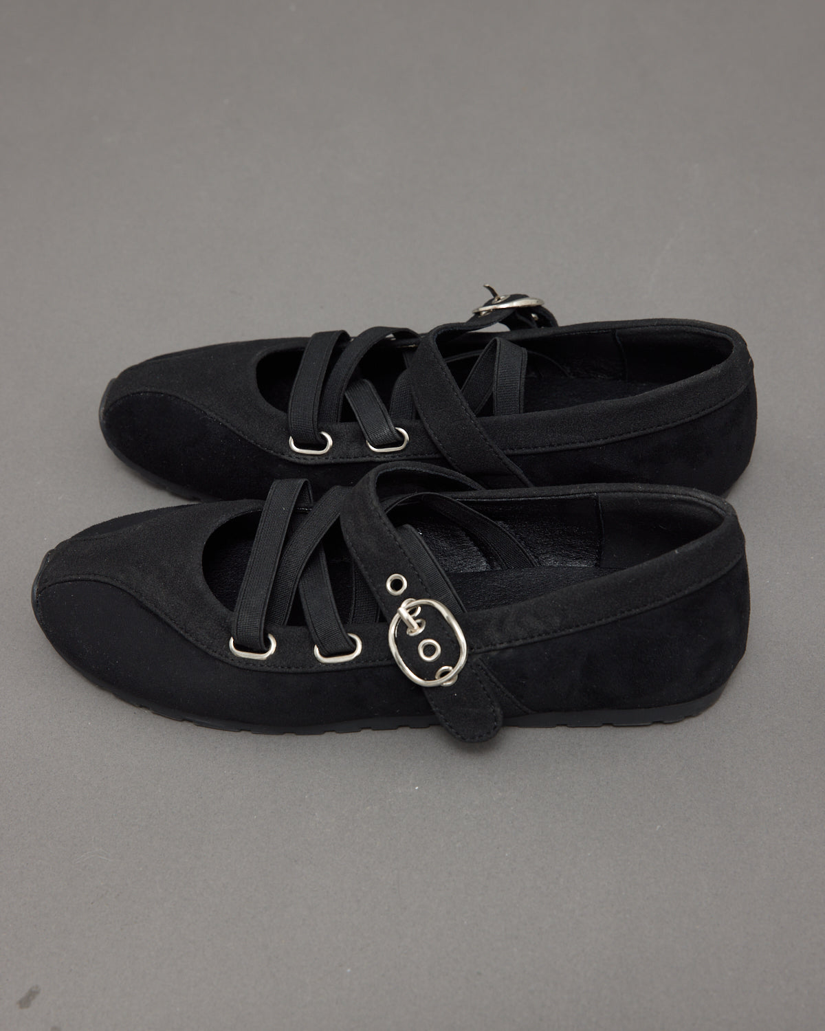 Comfortable vegan suede flats with double elastic straps and a side buckle for a chic everyday look.